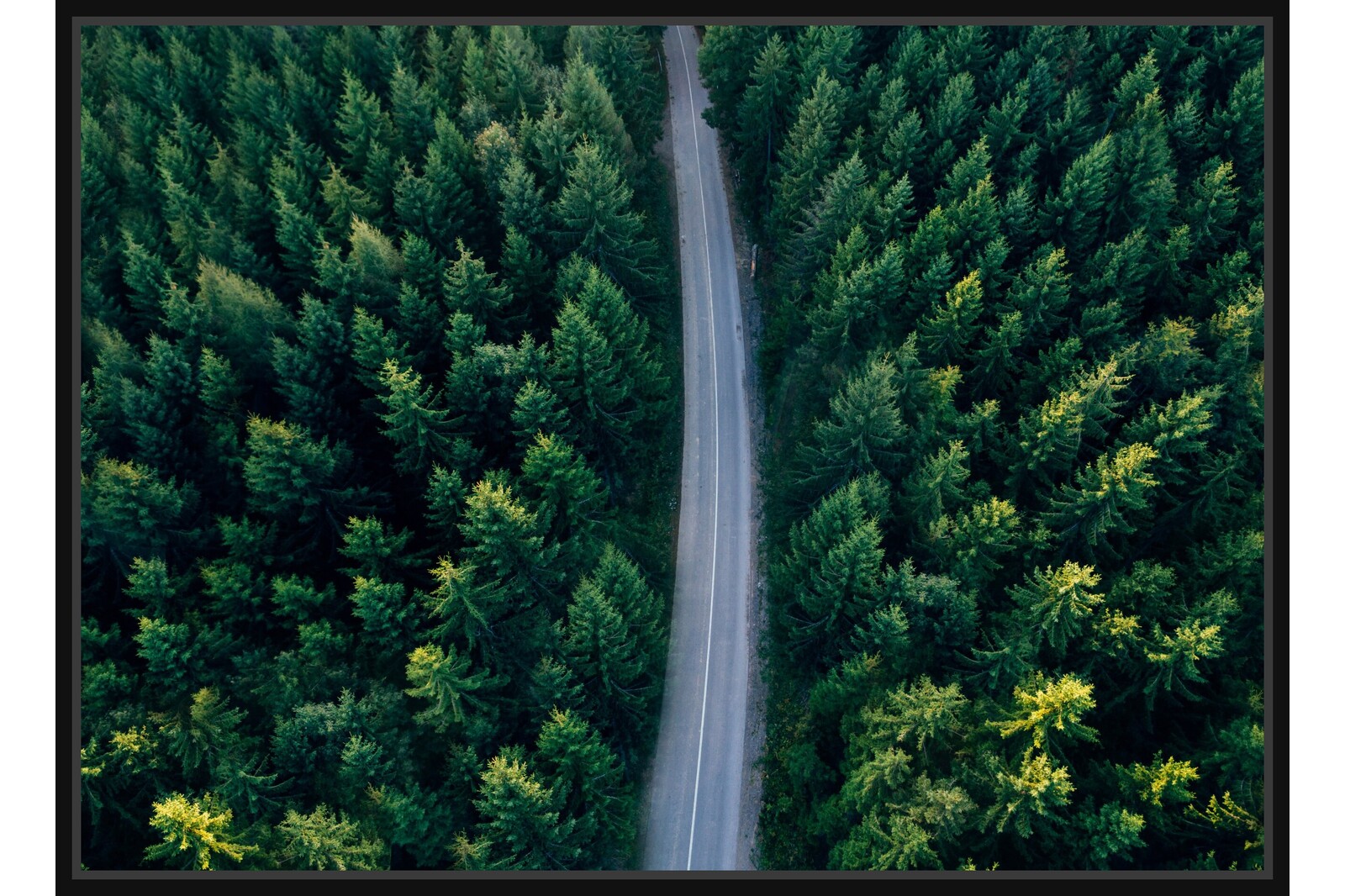 Въздушен изглед на път, който се извива сред гъста зелена борова гора. Символ на пътуване и връзка с природата.