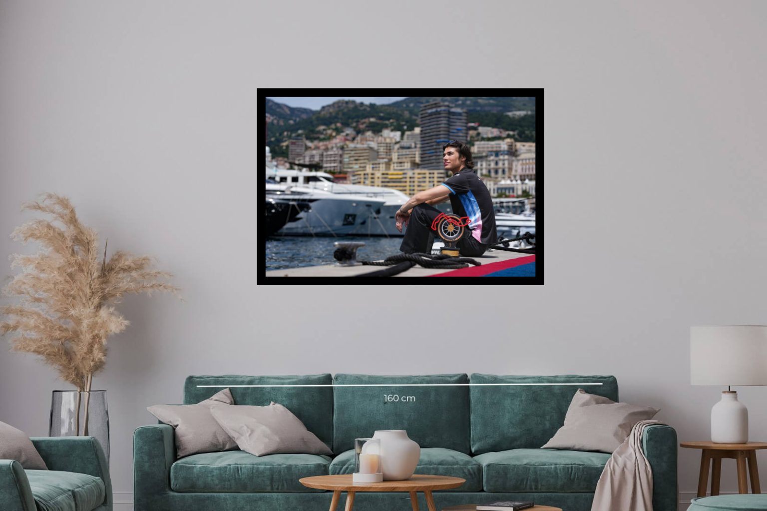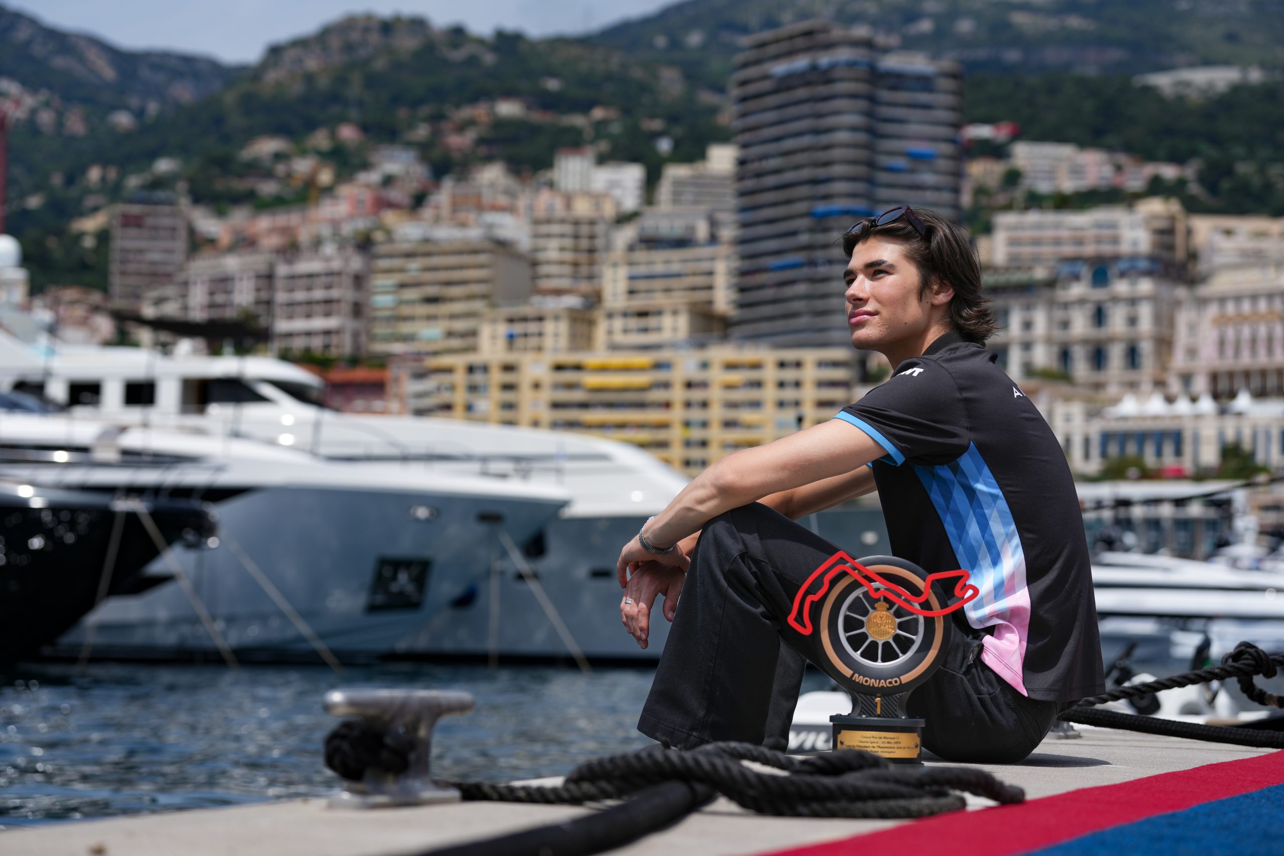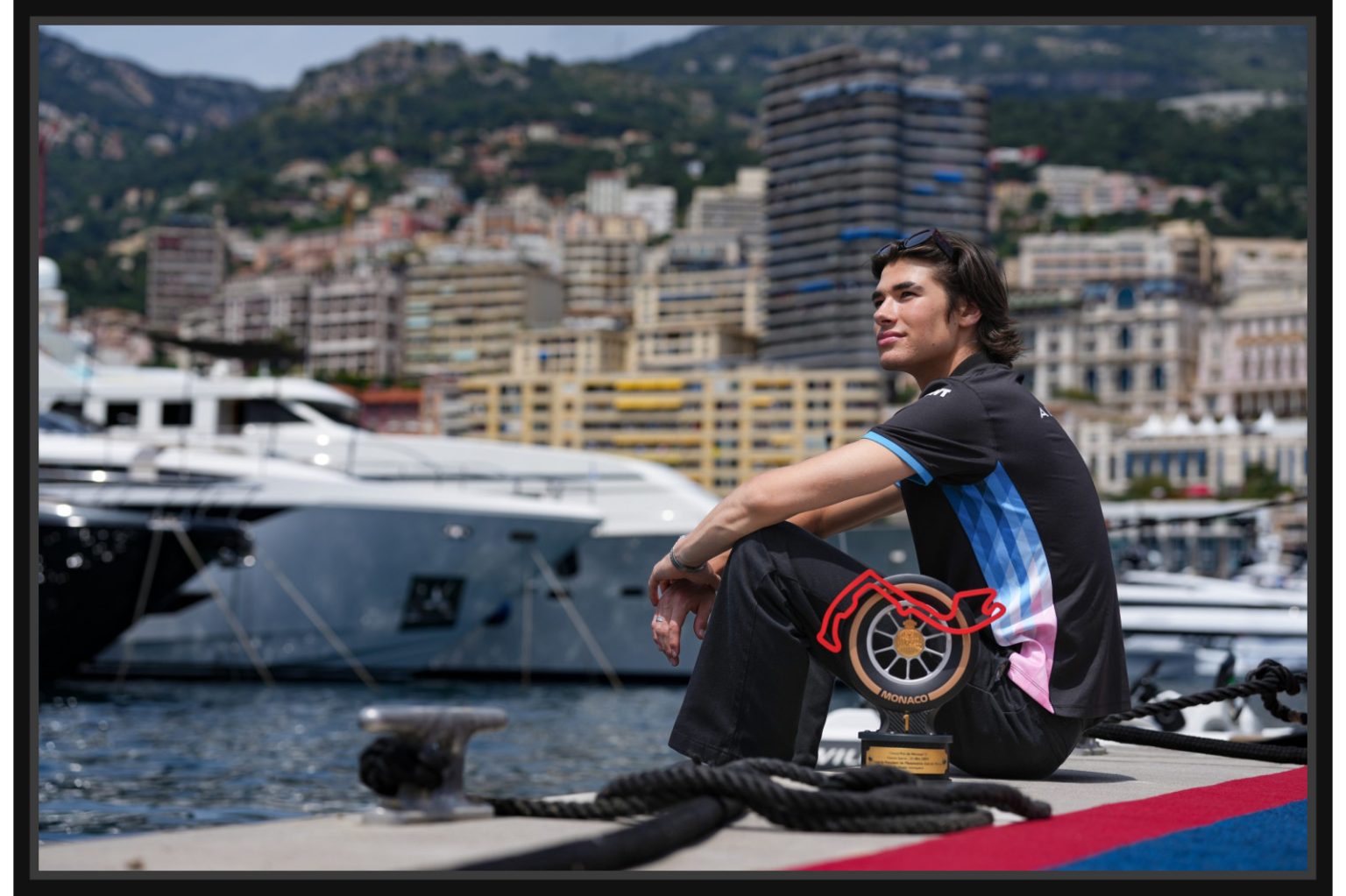 Портрет на млад пилот, седнал с купа на пристанището в Монако. Снимката комбинира спортната победа със спокойствието и красотата на града, създавайки емоционален баланс.