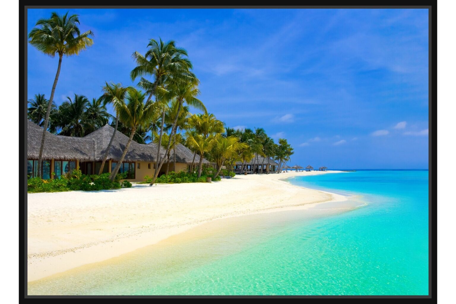 Снимка на бял пясъчен плаж с палми и кристално чисто море. Идиличен кадър, който пренася в екзотичен рай, идеален за почивка и релакс.