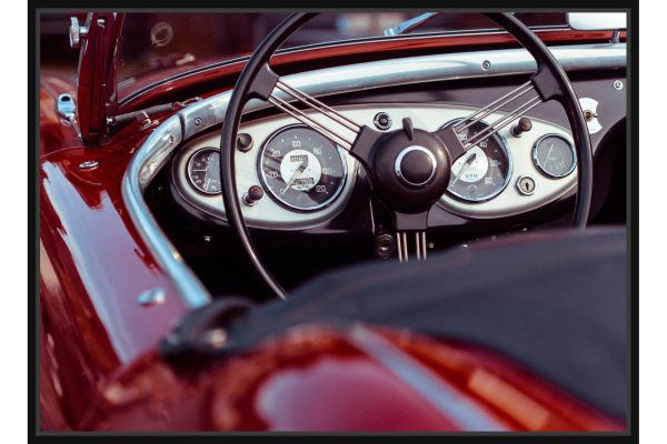 Интериор на класически автомобил с ретро волан и кожена тапицерия. Снимката улавя вниманието върху детайлите и придава усещане за история и стил. Това е кадър за ценители на класическите коли.