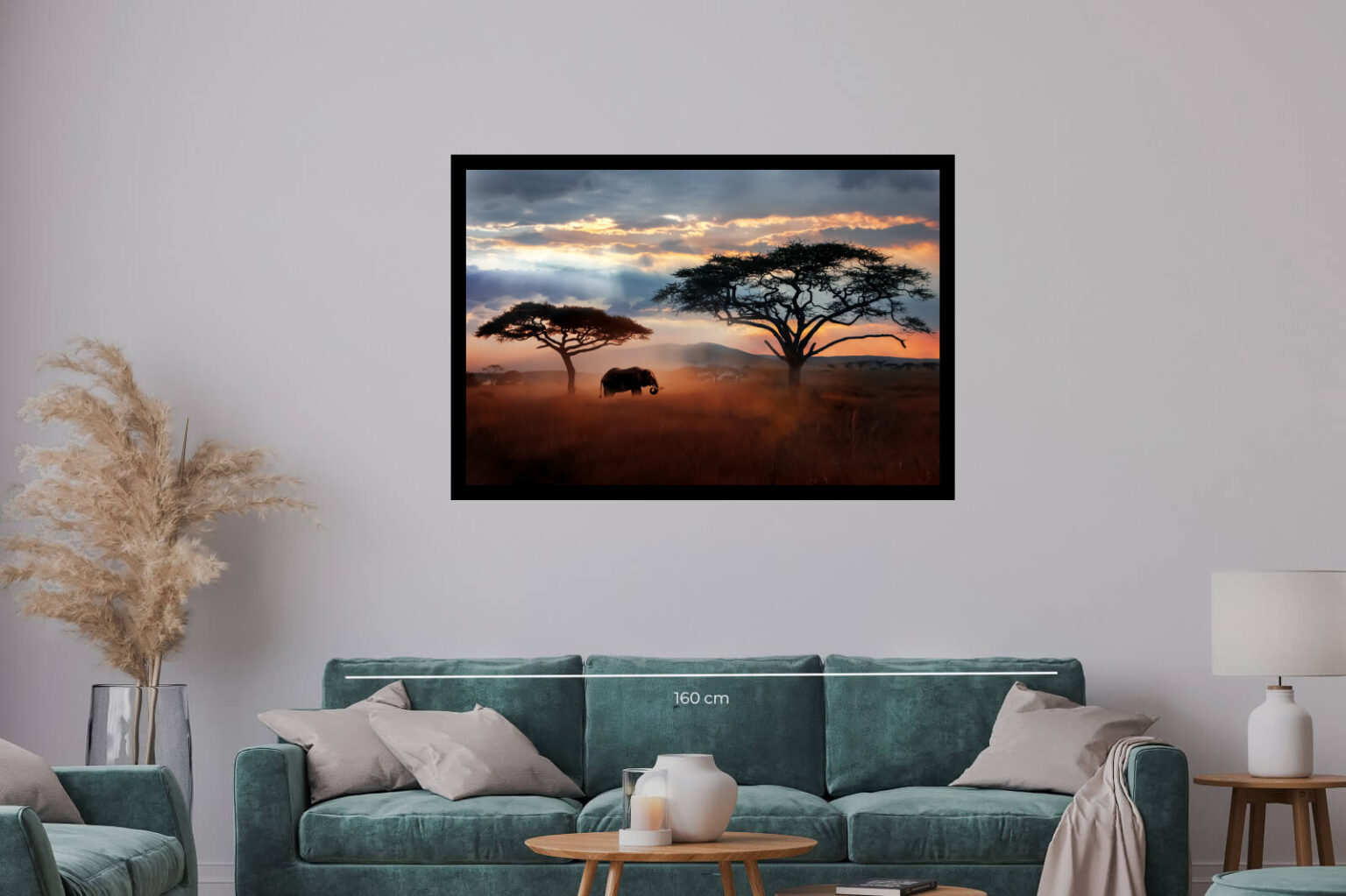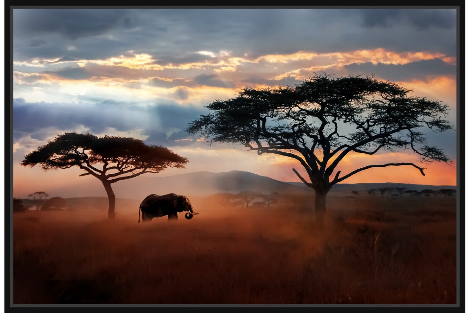 Въздействаща фотография на слон, преминаващ през саваната в първите часове на деня. Светлината от изгрева и прашинките във въздуха създават атмосфера на магия и величие.