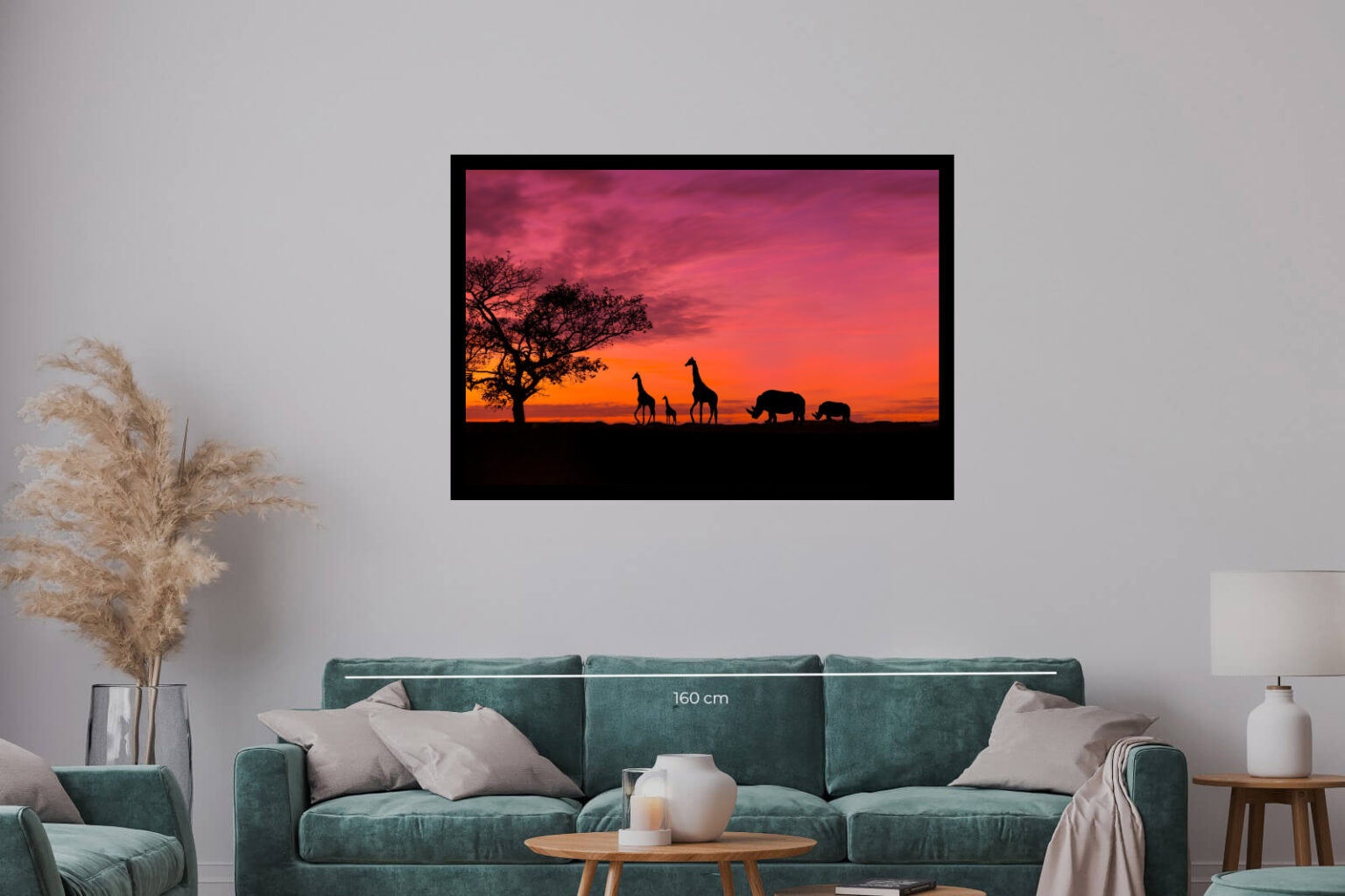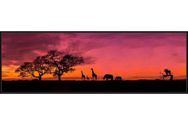 Драматична фотография на африканска савана при пурпурен залез. Силуети на жирафи, слон и други животни оформят пейзажа в хармония с дърветата и небето. Кадърът носи романтика и магията на дивата природа.