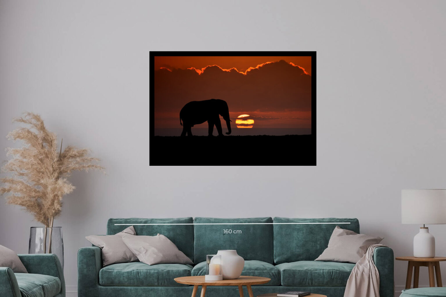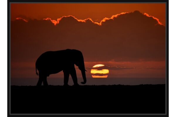 Силуетна фотография на слон, преминаващ пред залязващото слънце. Драматичното небе с наситени оранжеви и червени нюанси подчертава величието на животното и красотата на саваната.