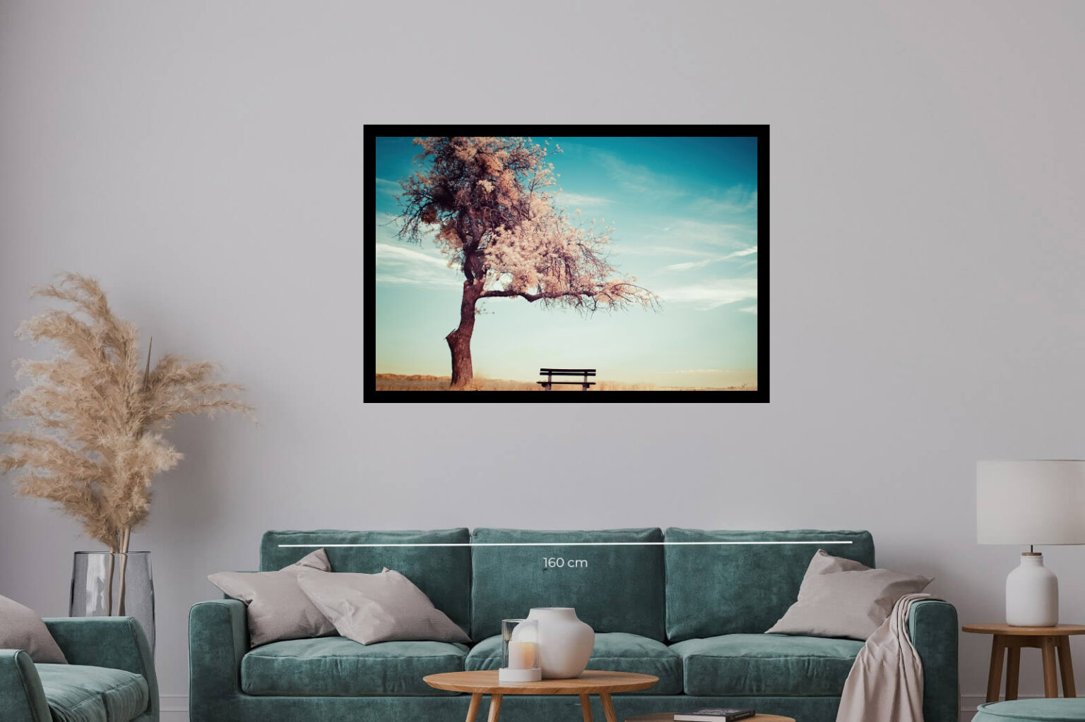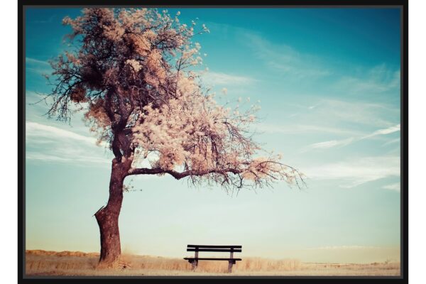 Романтичен пейзаж с разцъфнало дърво и самотна пейка под синьо небе. Сцената внушава спокойствие, носталгия и тишина сред природата.