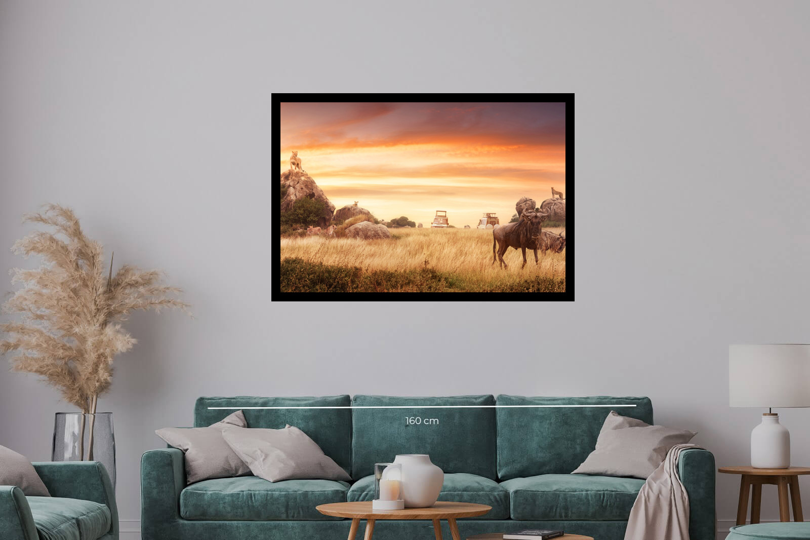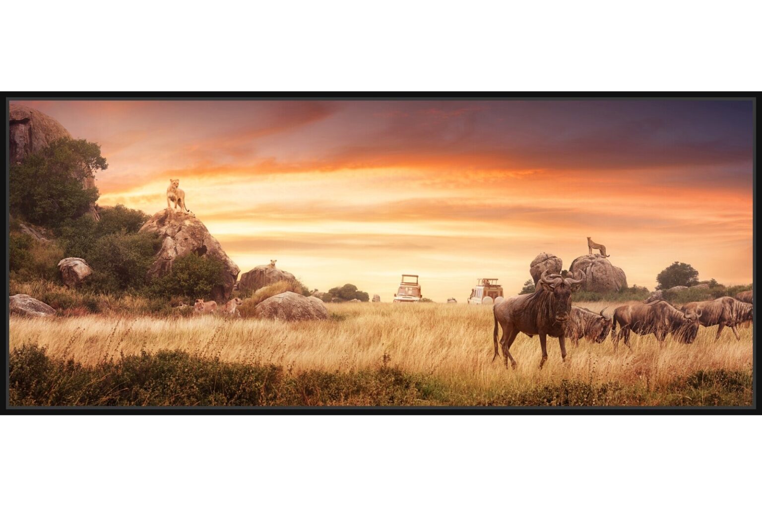 Атмосферна фотография на савана при залез с пасищни животни и сафари джипове. Лъвове върху скалите и гнута на преден план подчертават духа на дивата Африка.