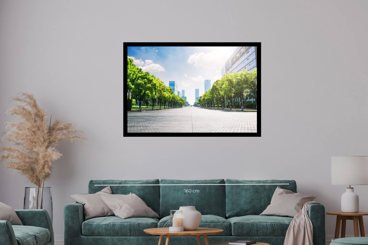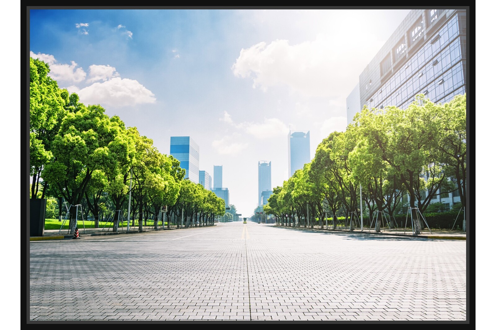 Слънчева градска сцена с просторен булевард, обграден от зелени дървета и модерни сгради. Фотографията излъчва свежест, спокойствие и хармония между природа и архитектура.
