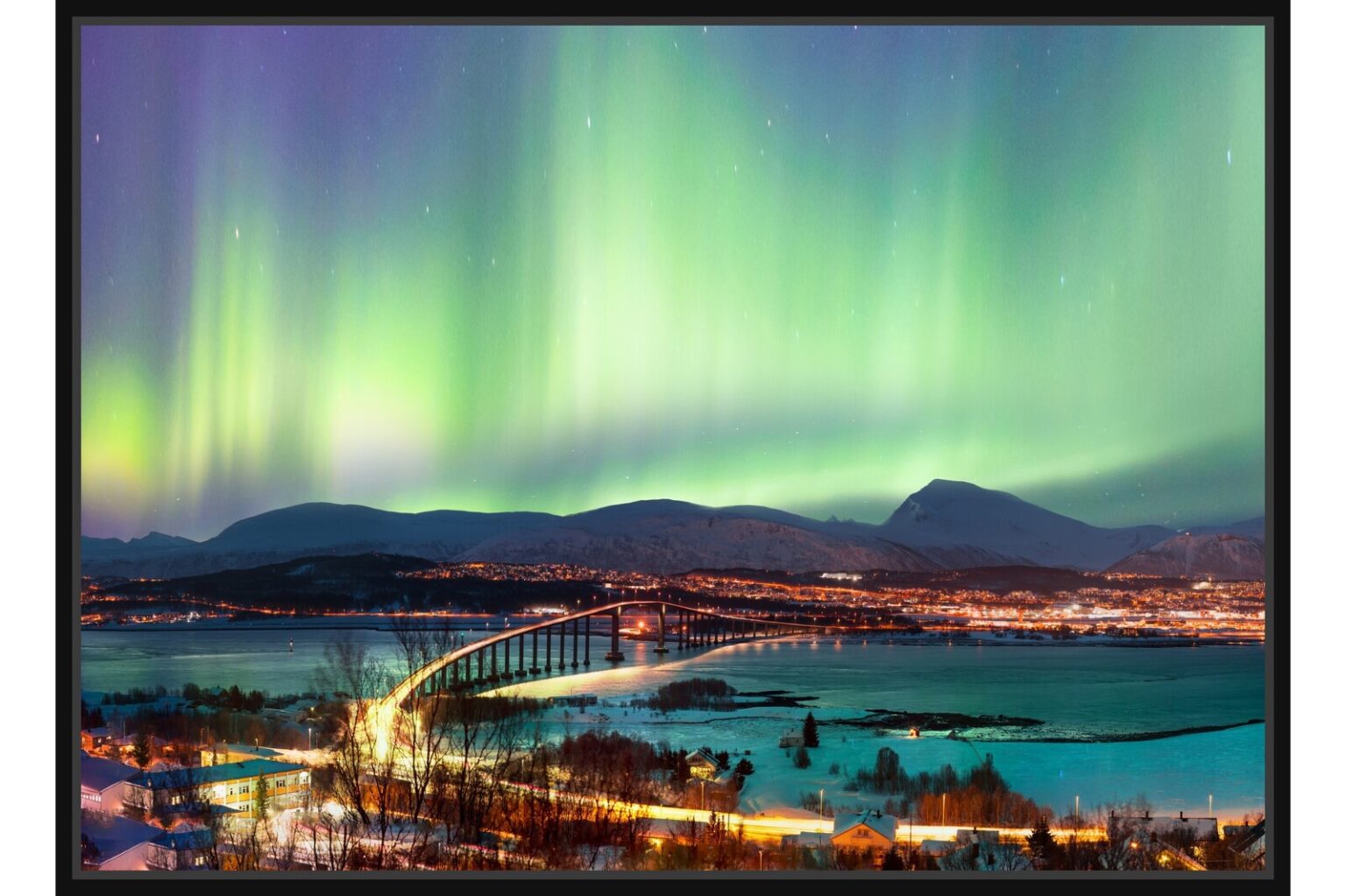 Впечатляващо северно сияние над скандинавски град и мост, свързващ двата бряга. Уникално съчетание на природно чудо и градски пейзаж.