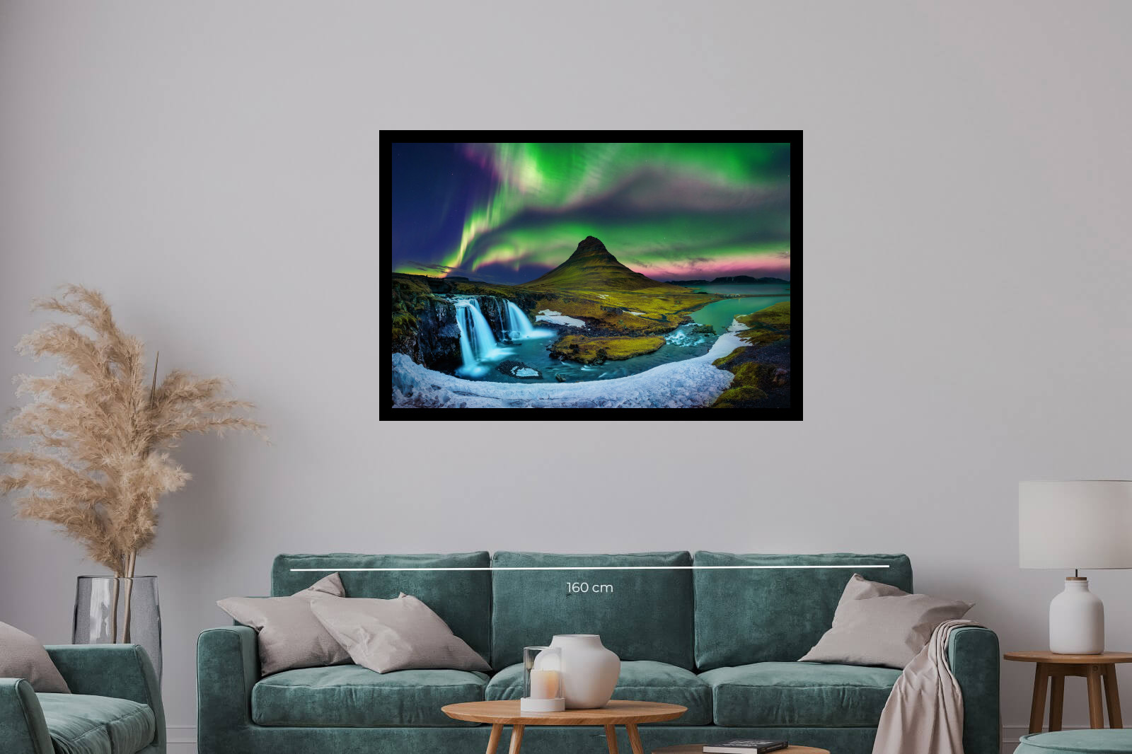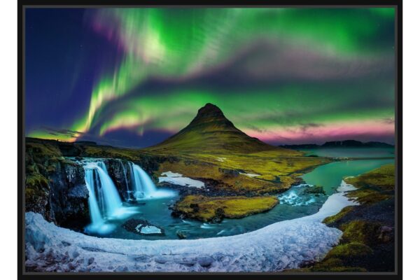 Северното сияние над планината Киркюфел в Исландия, със зелени светлини, отразени във водопад и снежен пейзаж. Магична сцена на северната природа.