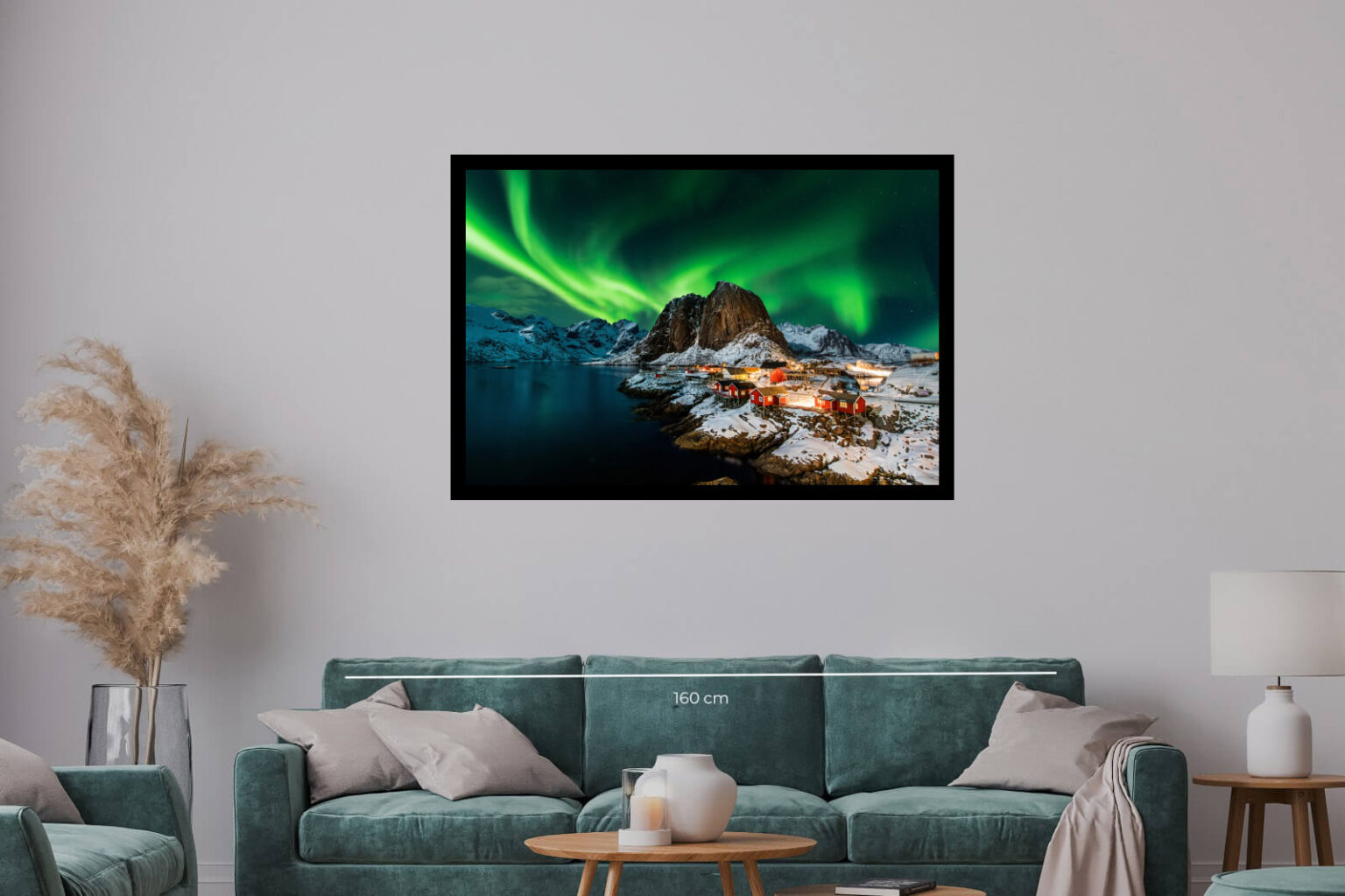 Ярко северно сияние над живописно рибарско селище с червени къщи и заснежени планини на Лофотенските острови. Вълшебна зимна сцена от Норвегия.