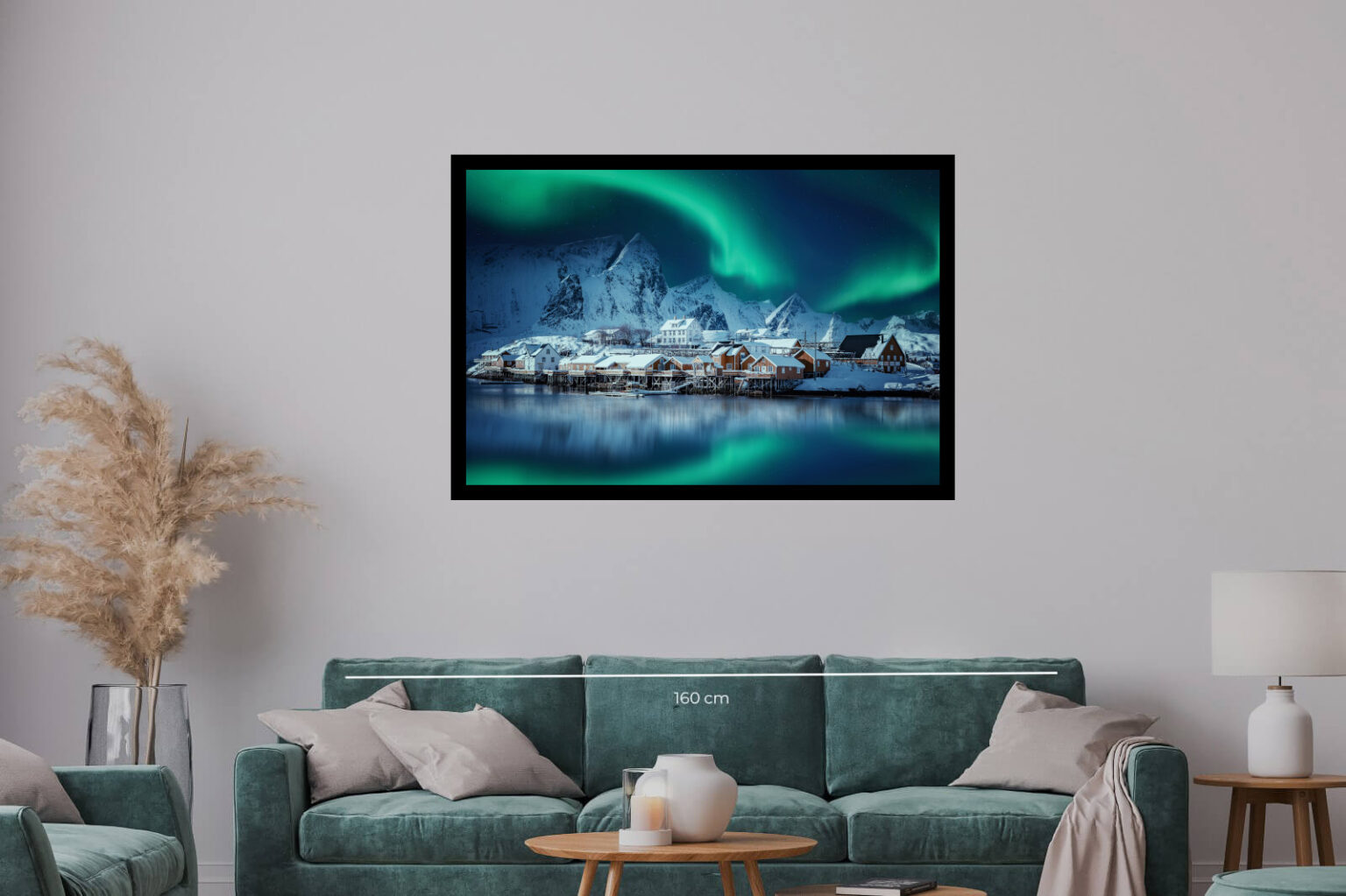 Северното сияние озарява нощното небе с ярко зелени светлини над снежни планини и тихо рибарско селце. Вълшебна арктическа сцена.