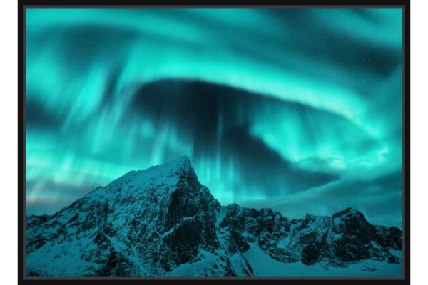 Ярко северно сияние, озаряващо нощното небе над заснежена планина. Зелените светлини създават магична и мистична атмосфера.