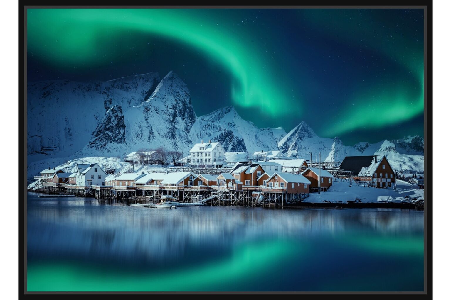 Ярко северно сияние над малко рибарско селище в Норвегия със снежни планини и спокойна вода. Магична северна нощ.