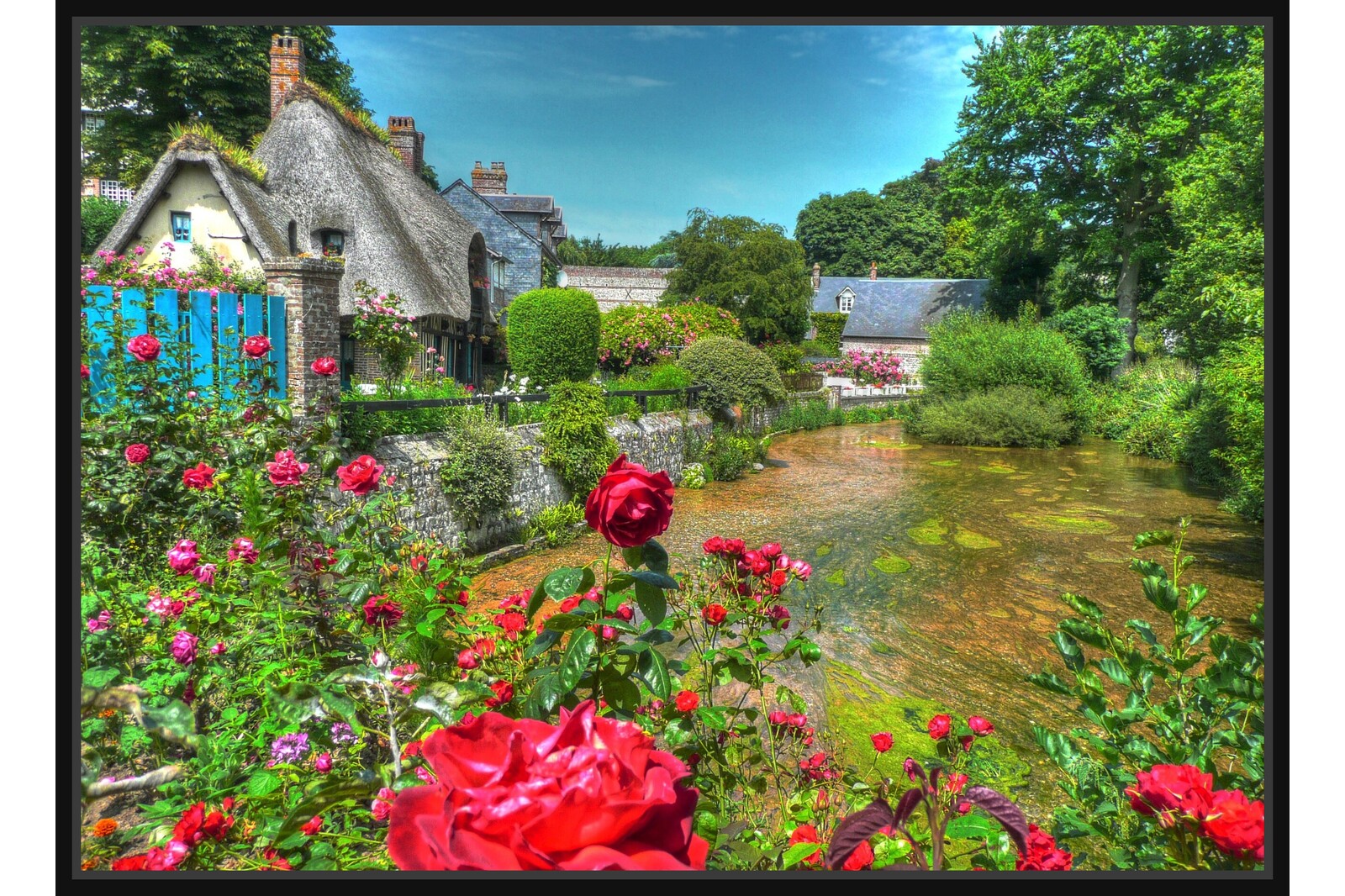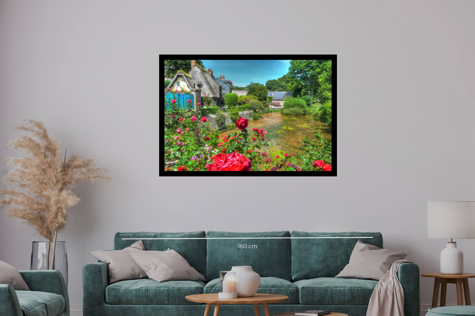 Очарователна селска къща с покрив от слама, заобиколена от разцъфнали рози и тиха река. Сцената напомня приказен пейзаж от старо английско село.