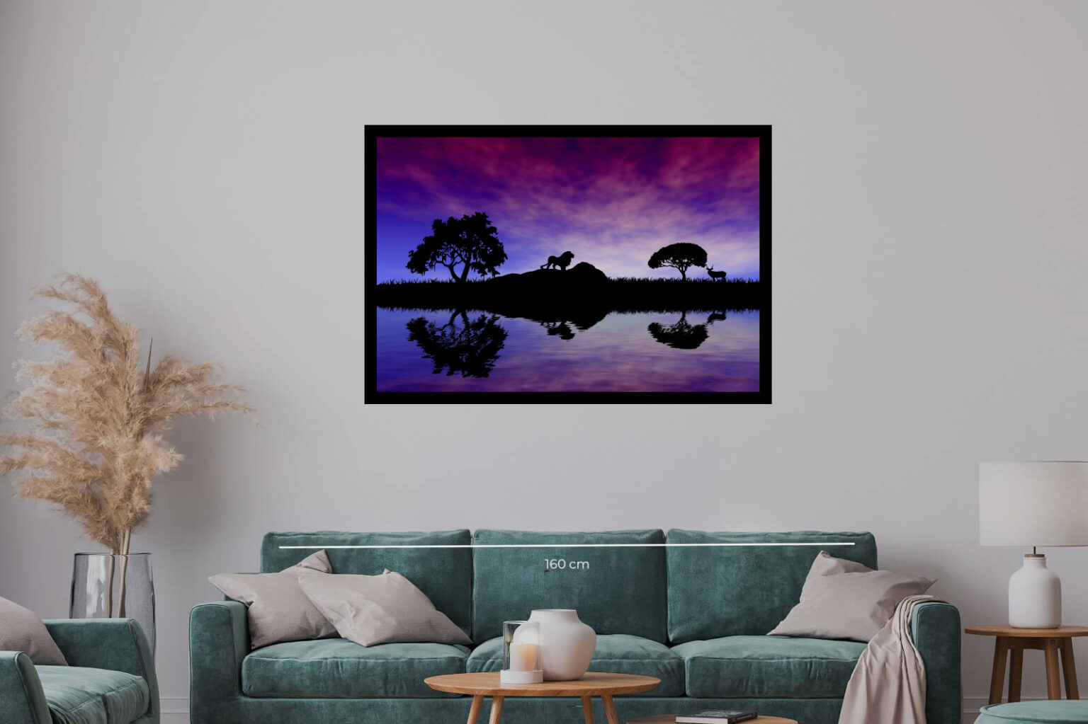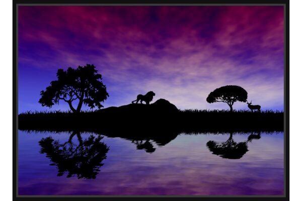 Силуети на дървета и животни в африканската савана, отразени във водна повърхност. Виолетово-оранжевото небе при залез създава драматичен и топъл контраст.