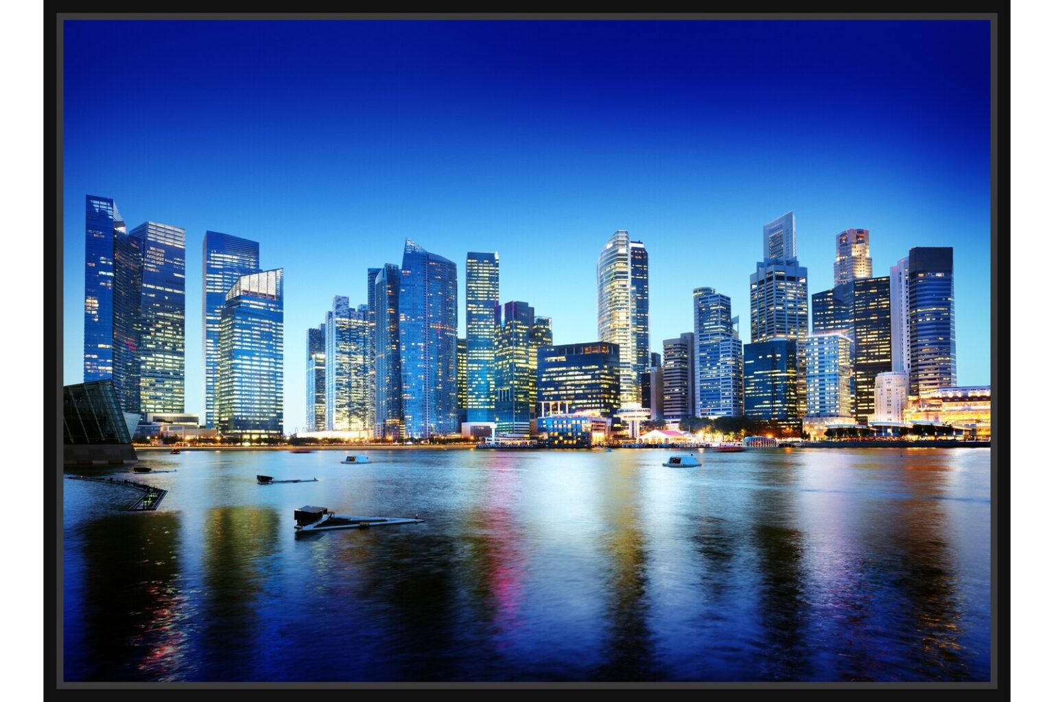 Нощна фотография на бизнес района в Сингапур с модерни небостъргачи и отражения върху водата. Ярките светлини подчертават динамиката и футуристичния дух на града.
