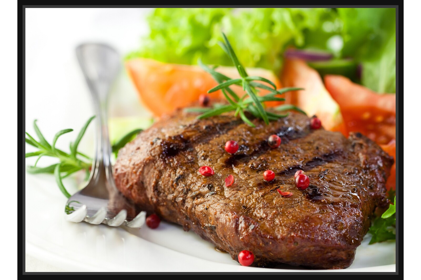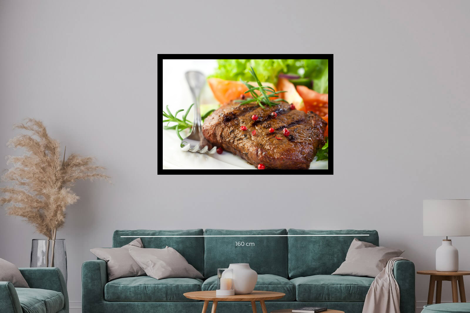 Апетитен сочен стек, сервиран с пресни зеленчуци – домати, салата и розмарин. Снимката показва перфектно изпечено месо с хрупкава коричка и свежи подправки.