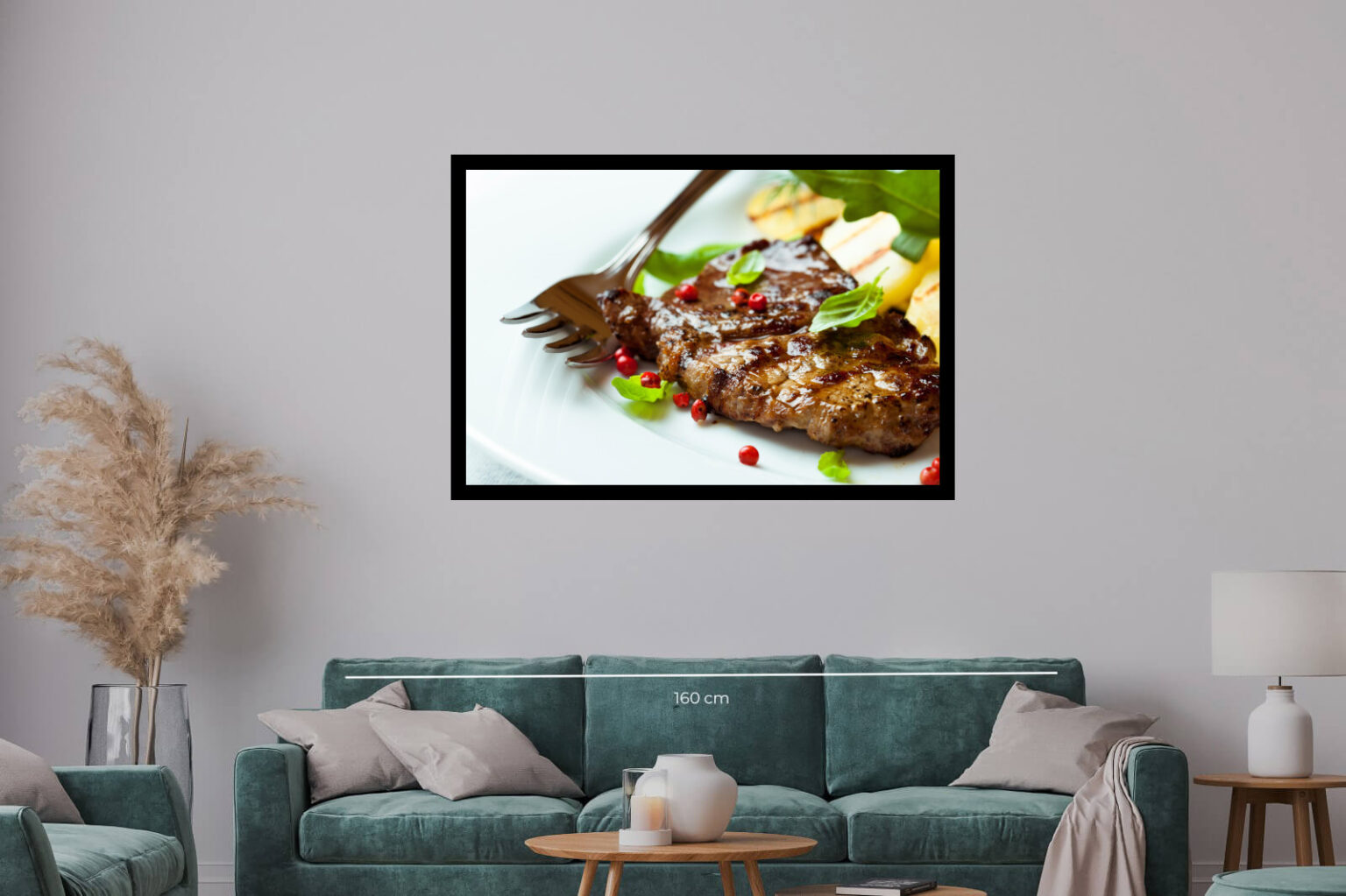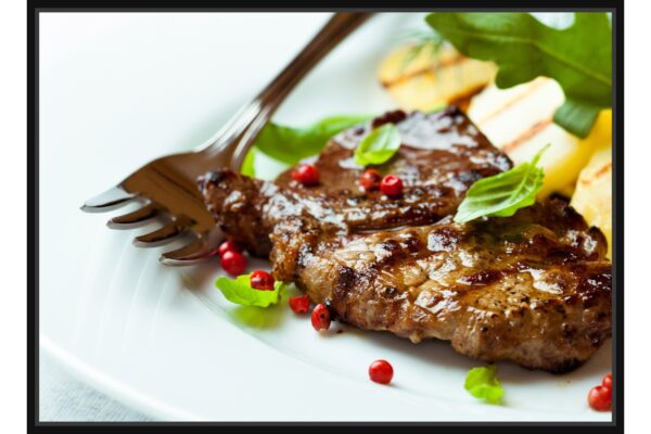 Ароматен стек, гарниран с пресни зеленчуци, розов пипер и свежи билки. Сервиран върху елегантна чиния, този стек е идеалното гурме преживяване за ценителите на месото.