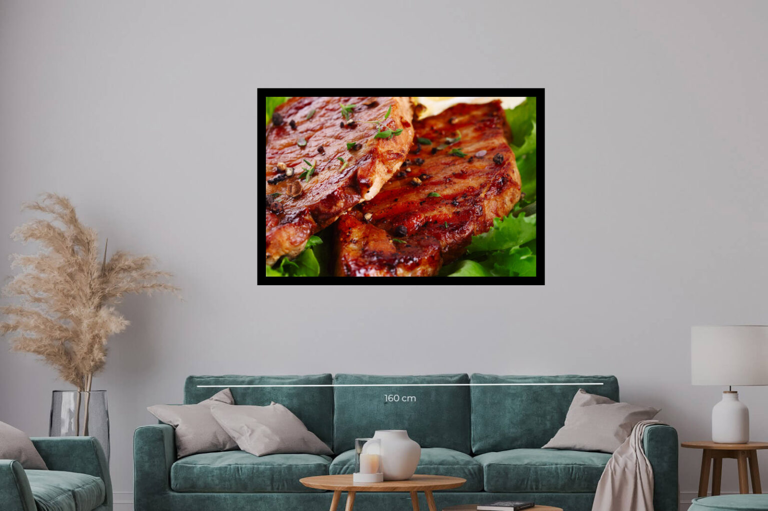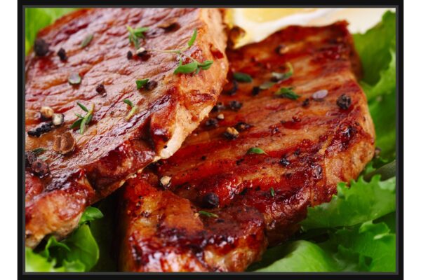 Две сочни парчета печено месо на скара, поднесени върху свежи зелени листа и гарнирани с резен лимон. Ястието е заснето отблизо, за да подчертае текстурата и вкусовата наслада.