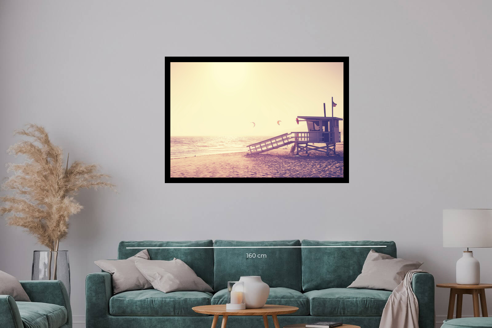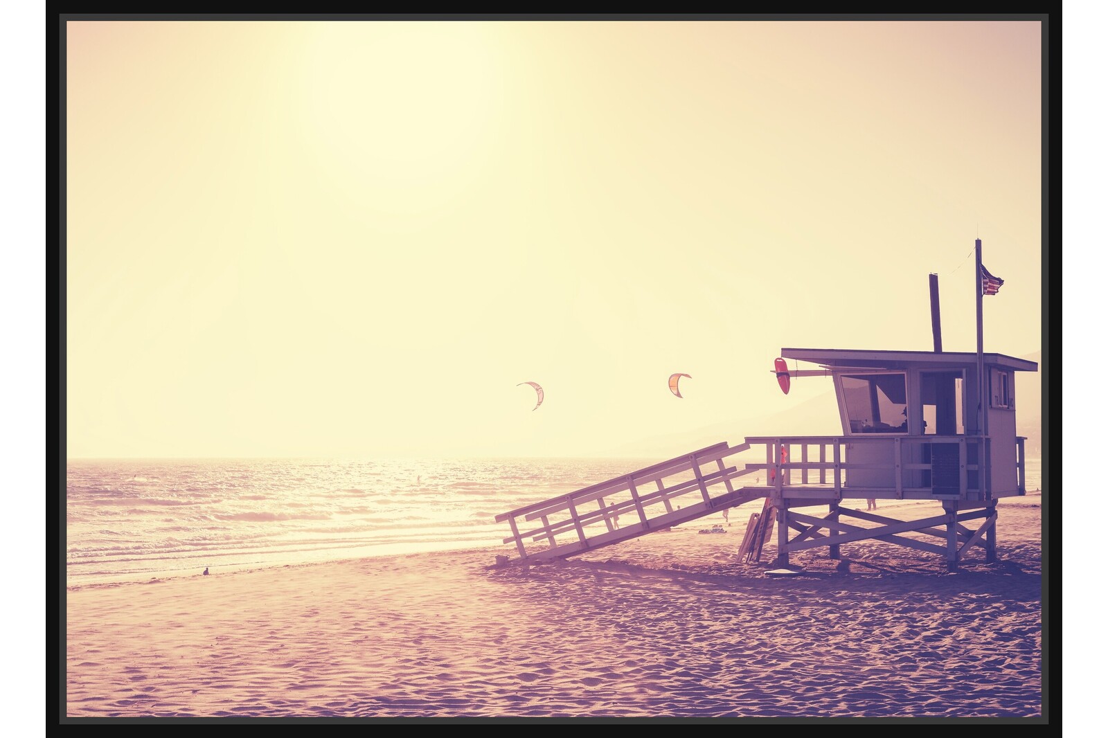 Артистична снимка на плаж с дървена спасителна кула, обляна в златистите лъчи на залеза. В небето се виждат хвърчила и парапланери, които подсилват романтичното настроение.