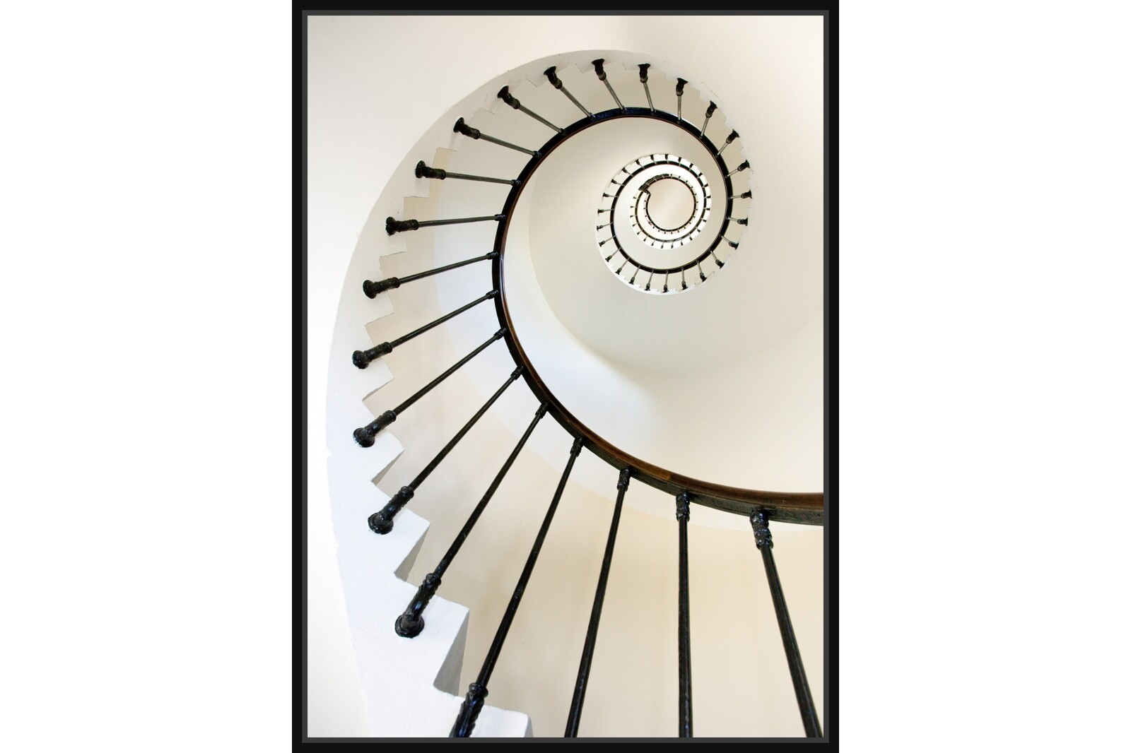 Фотография на спирално стълбище, гледано отдолу, с черни парапети и бели стени, създаваща геометричен ефект.