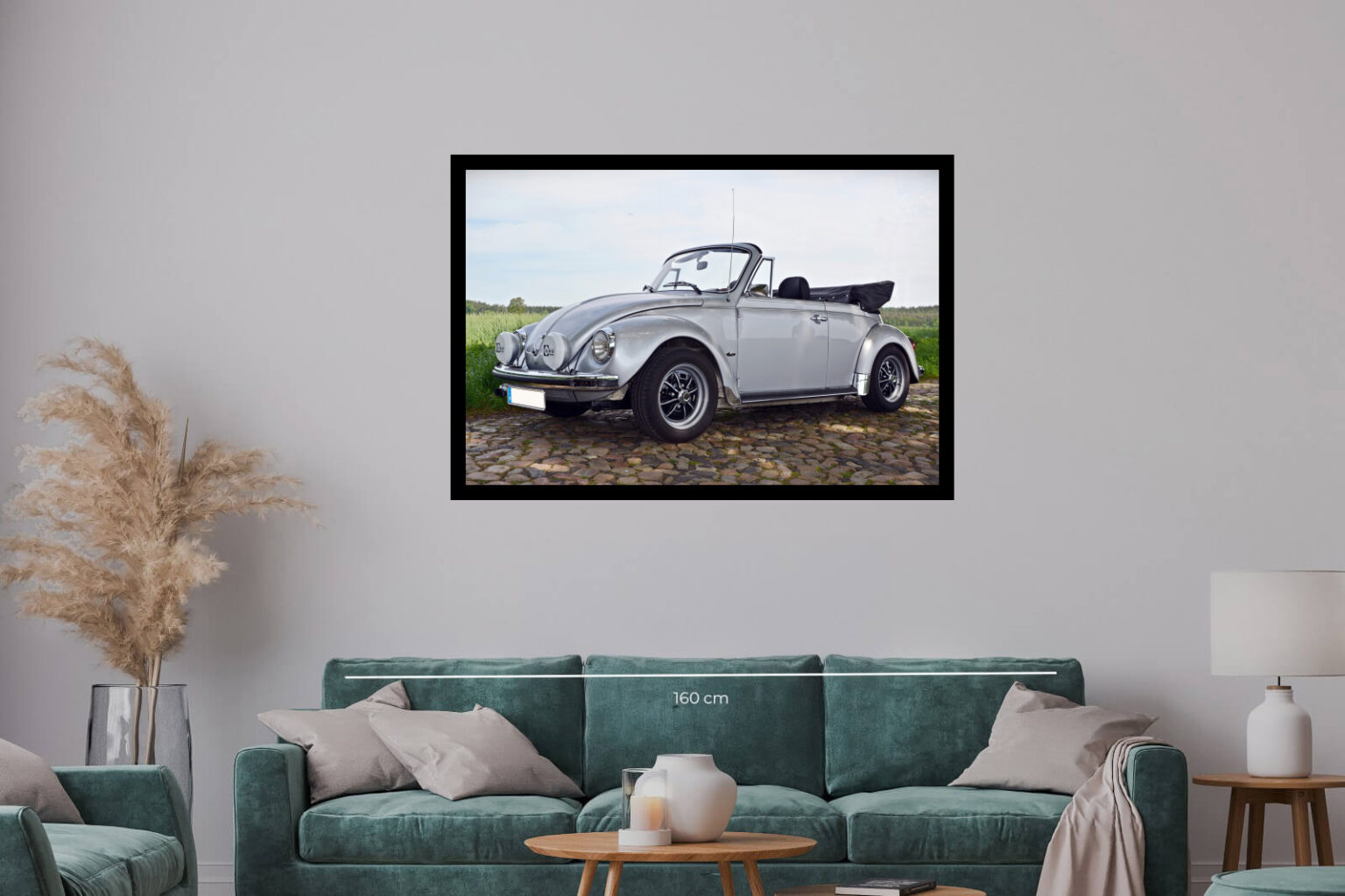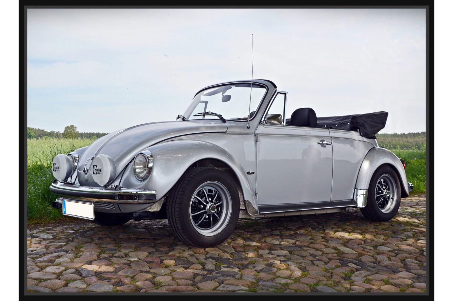 Класически Volkswagen Beetle кабриолет в елегантно сребристо, паркиран върху каменна настилка сред зелена природа. Снимката съчетава историята на емблематичния модел с усещане за свобода и вечност.