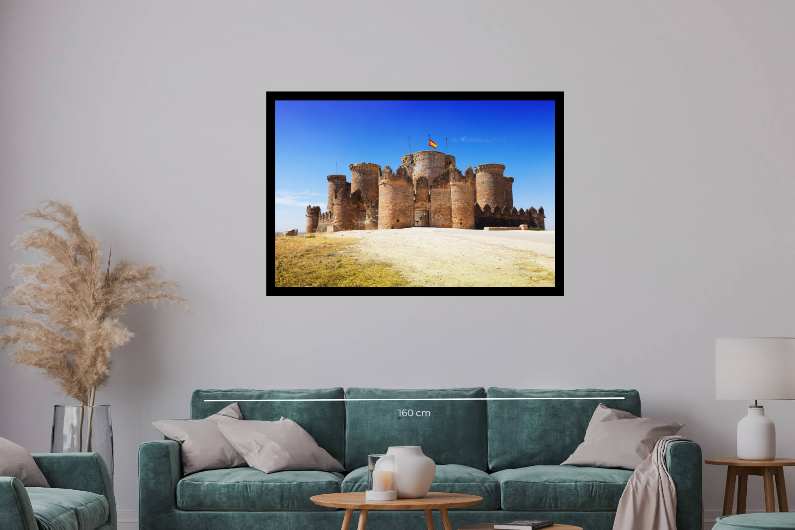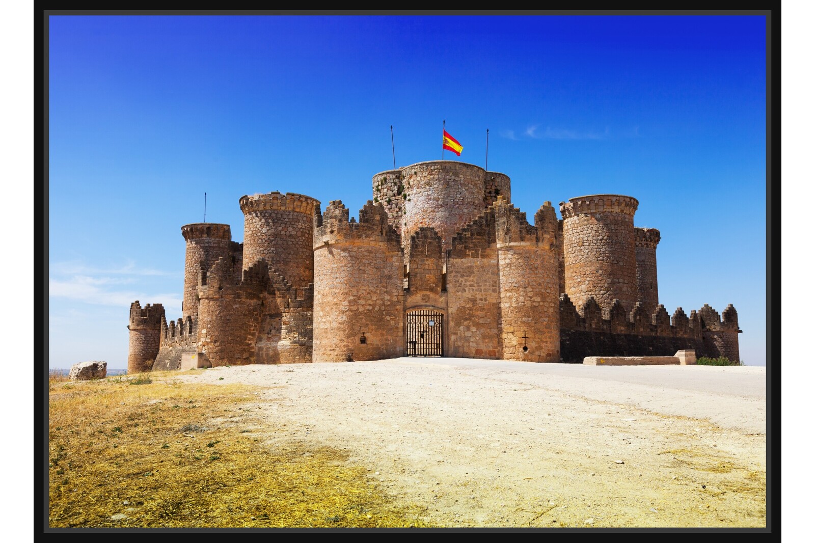 Фотография на величествен средновековен замък в Испания, заснет под синьото небе. Каменната архитектура, испанското знаме и слънчевата светлина подчертават историческия и културен дух на мястото. Подходящо произведение за интериор с акцент върху традиция и сила.