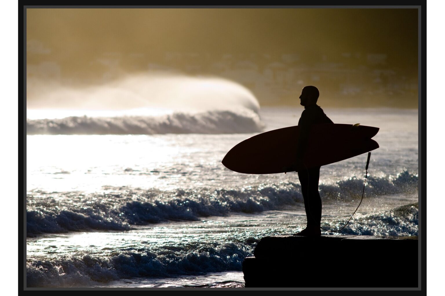 Драматичен кадър на сърфист, заснет в силует срещу първите утринни лъчи. Морските вълни и златната светлина създават усещане за енергия, свобода и приключение.