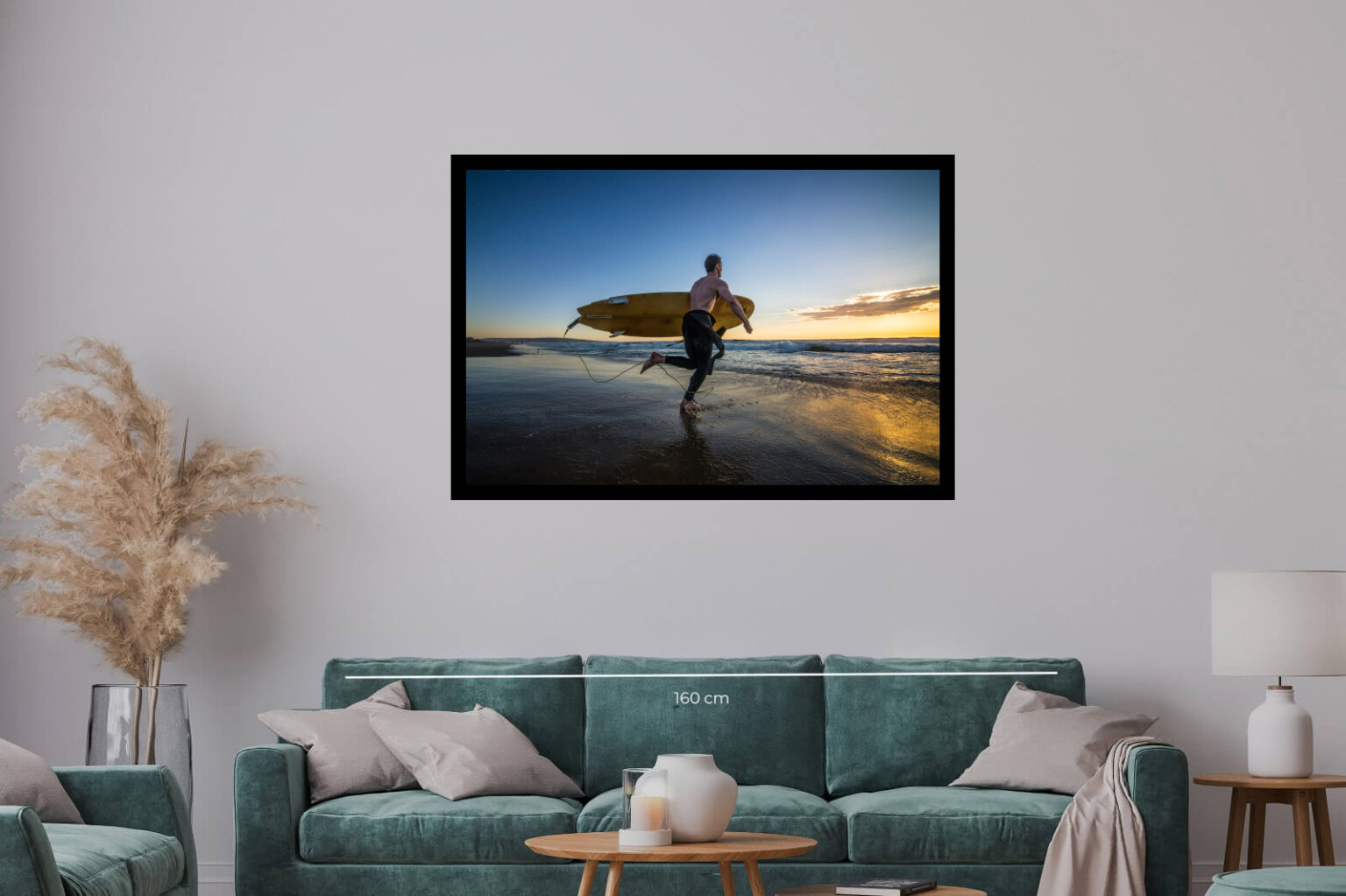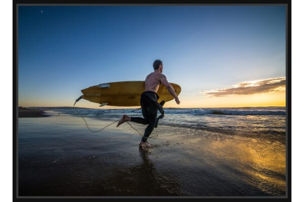 Мощна фотография на сърфист, който тича към морето с дъска под мишница. Залязващото слънце и отблясъците по мокрия пясък създават динамична и енергична композиция.