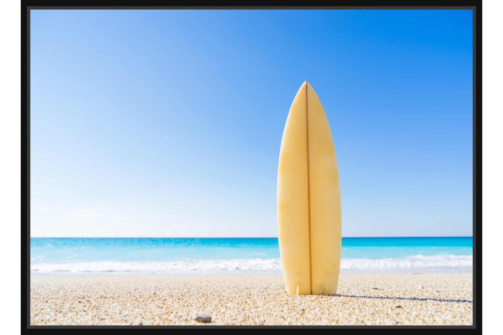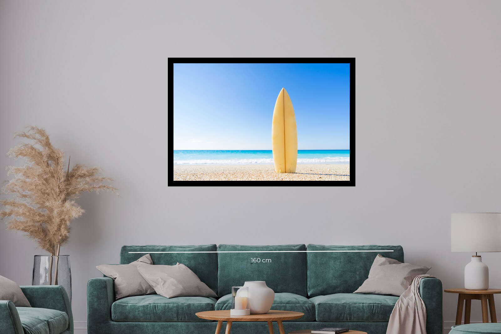 Минималистична фотография на сърф дъска, изправена върху пясъчен плаж с безкрайно синьо небе и кристално море. Снимката създава усещане за свобода, приключение и летен дух.