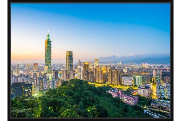 Панорамна фотография на Тайпе с емблематичната кула Тайпе 101, която извисява модерния градски пейзаж. Златните нюанси на залеза се преливат с градските светлини, подчертавайки динамиката на тайванската столица.