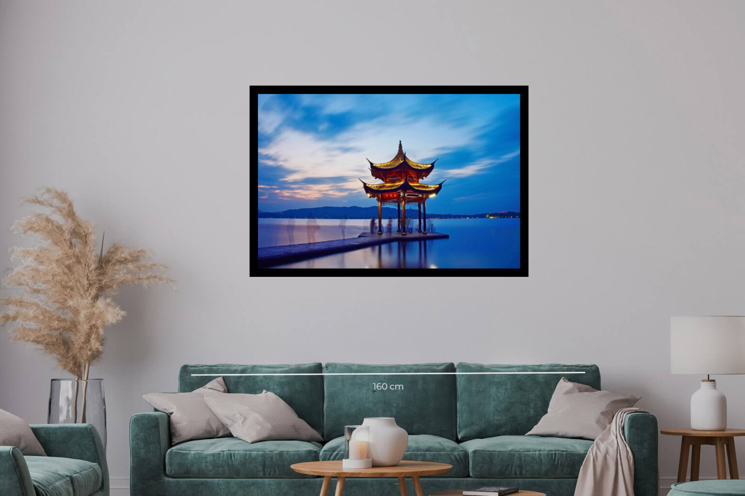 Снимка на традиционен китайски павилион, разположен на брега на езерото Сиху в Ханджоу. Вечерните цветове на небето се отразяват в спокойните води, създавайки хармонична и романтична атмосфера.