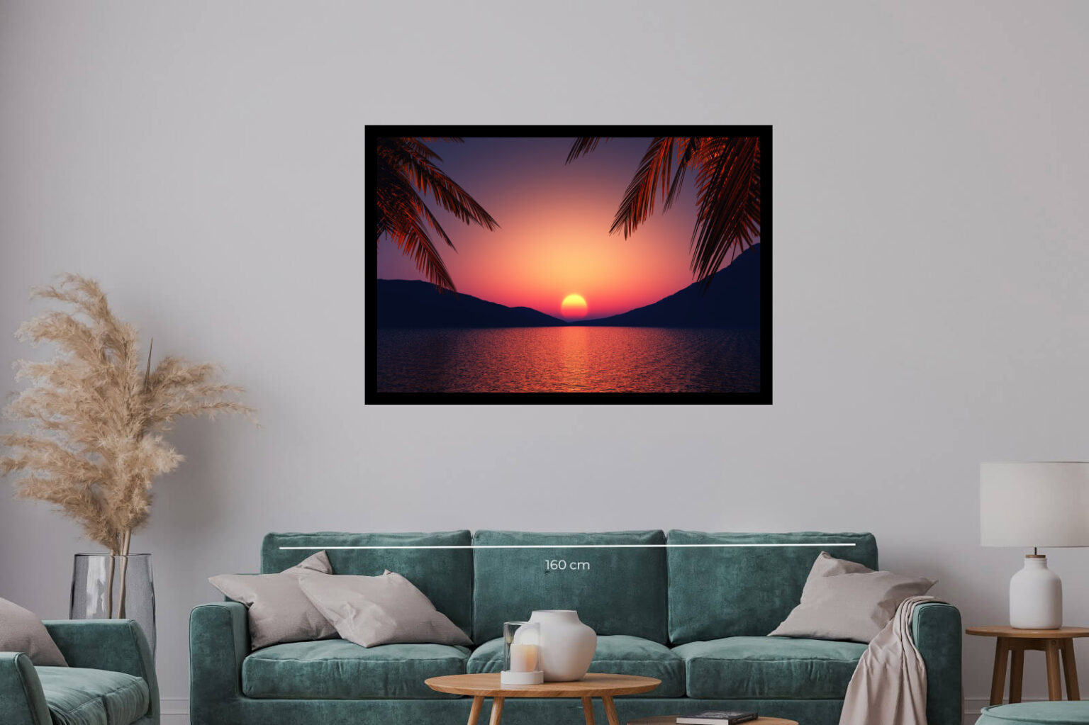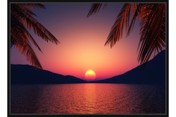 Впечатляващ залез над спокойното море с палмови клони в преден план, създаващ усещане за екзотика и романтика.