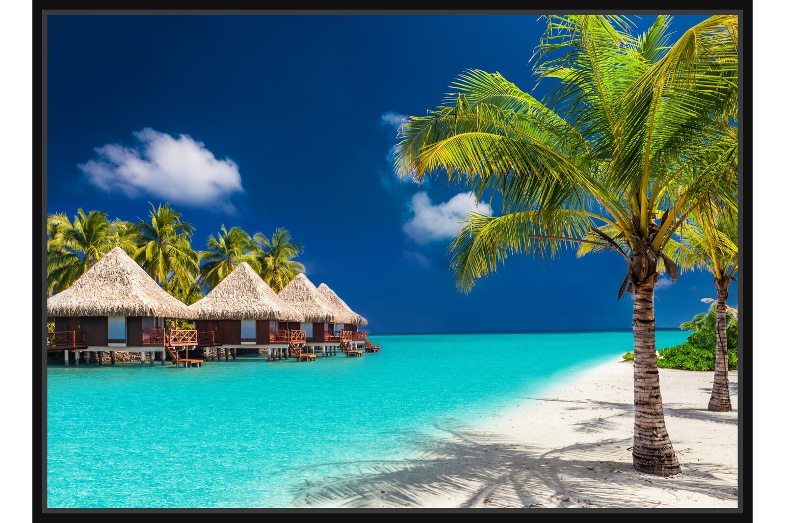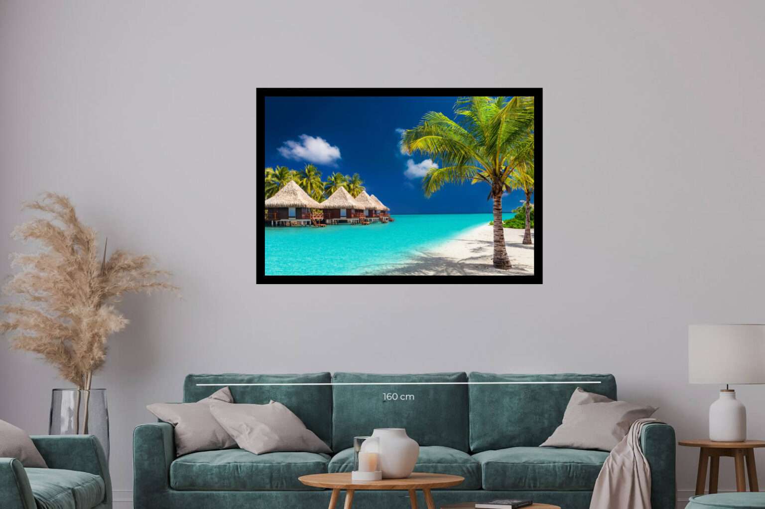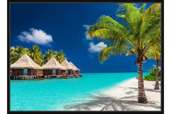 Фотография на екзотичен тропически плаж с бунгала над водата, палми и тюркоазено синя вода. Кадърът носи усещане за спокойствие и мечтана ваканция на островен рай.