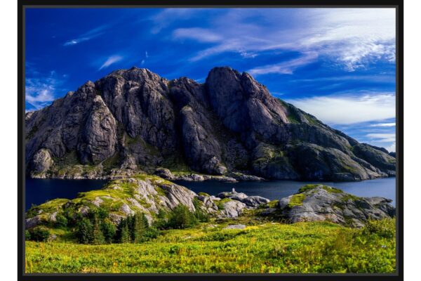 Панорамна гледка към норвежки фиорд с величествени скали, зелени склонове и дълбоко синьо море. Чиста и свежа природа в пълния си разкош.