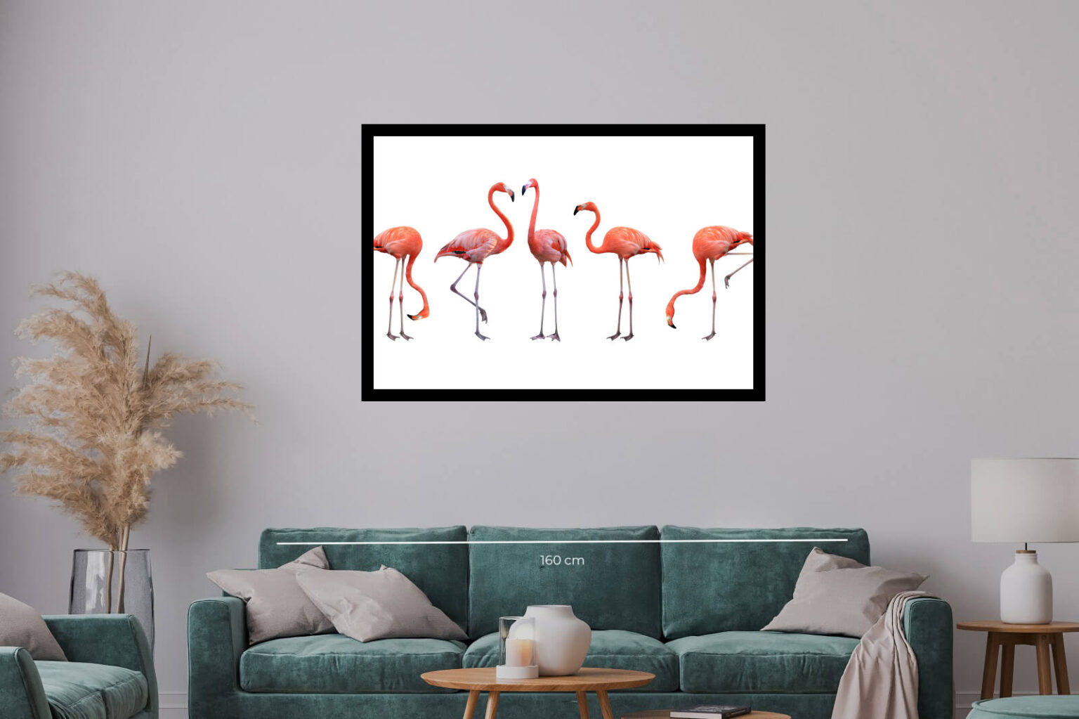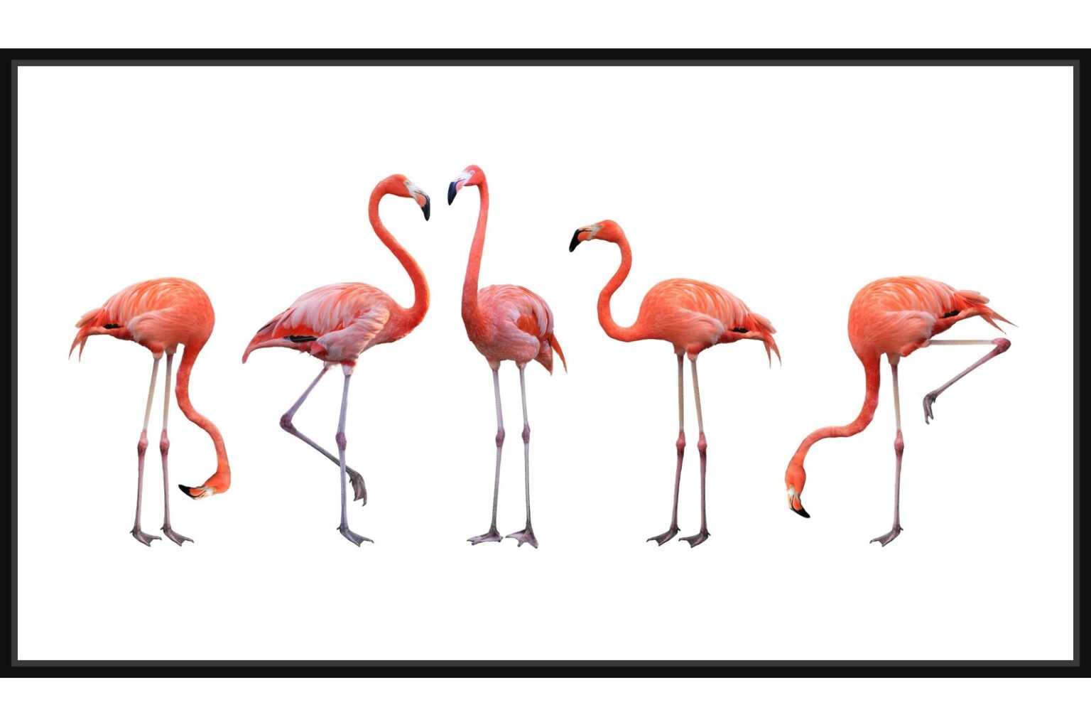 Елегантна фотография на група фламинго върху бял фон. Техните изящни пози и розови пера създават хармония и артистичност, превръщайки снимката в минималистичен, но изключително изразителен кадър.