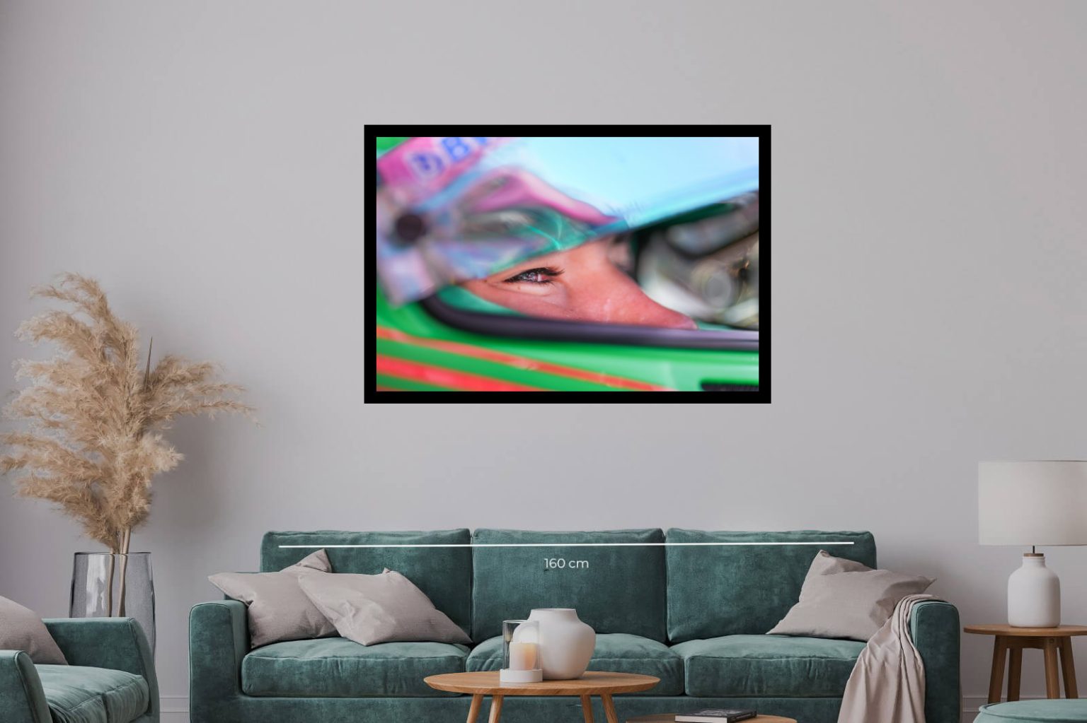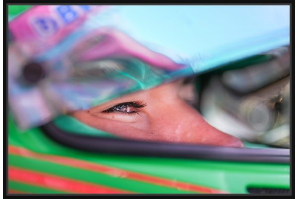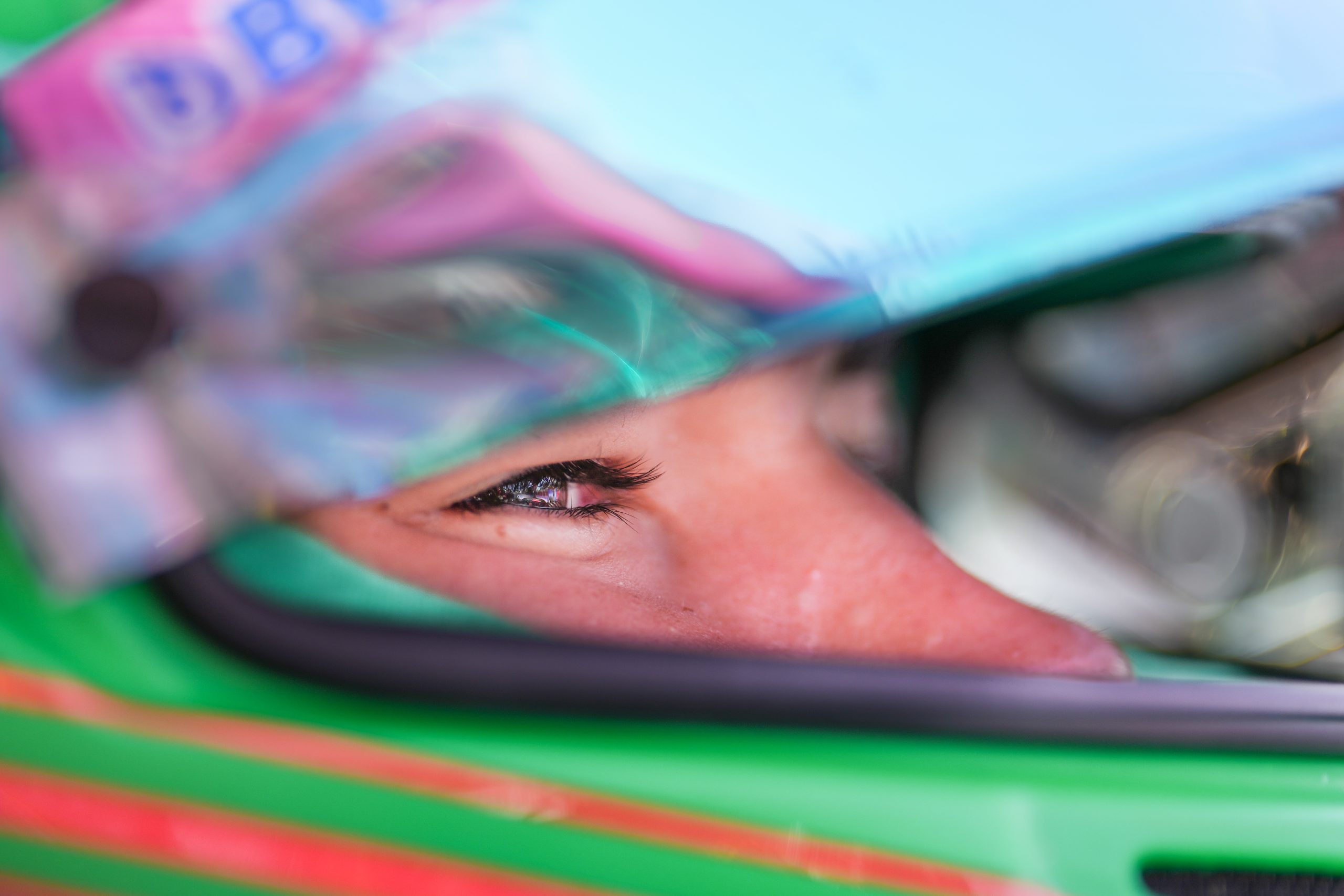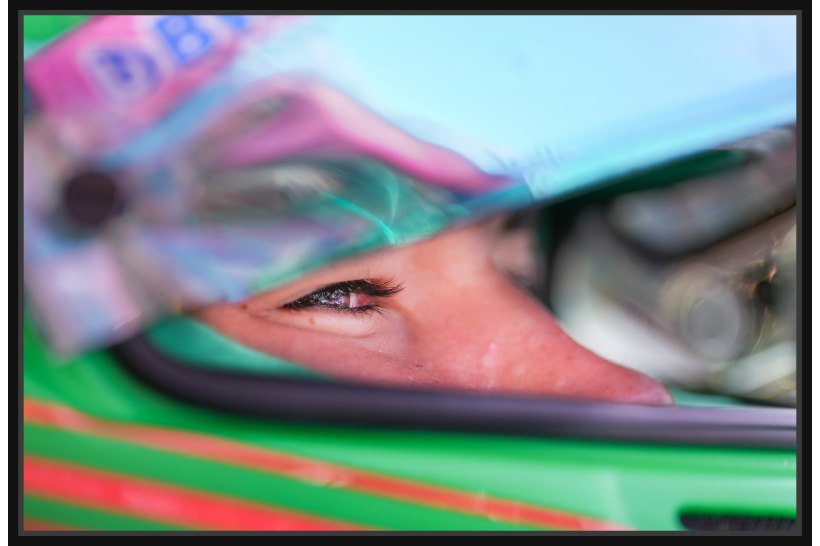 Близък план на пилот във Формула 3, заснет през визьора на каската. Снимката подчертава концентрацията и решителността в очите на състезателя, символизирайки силата на духа в моторните спортове.