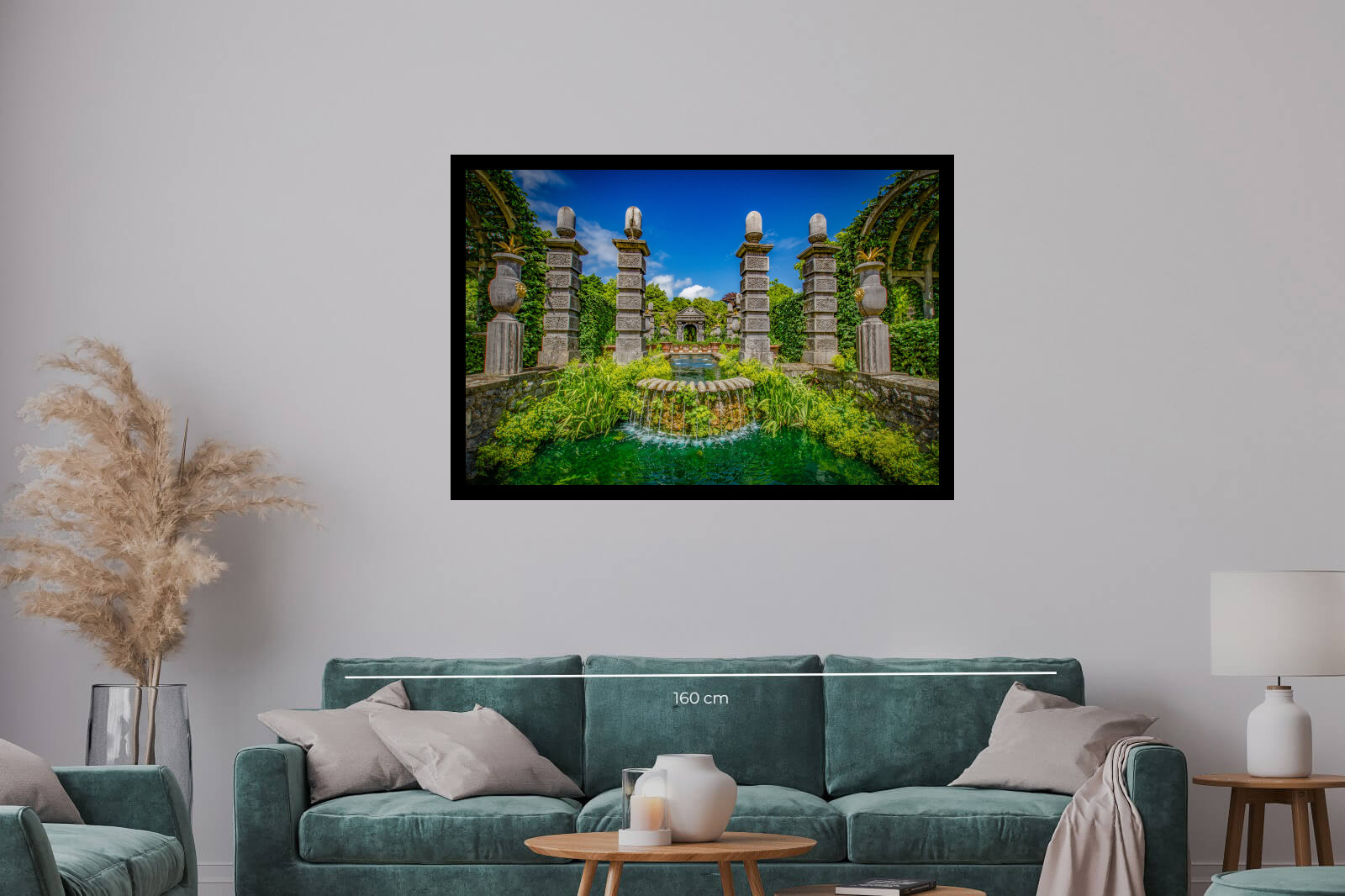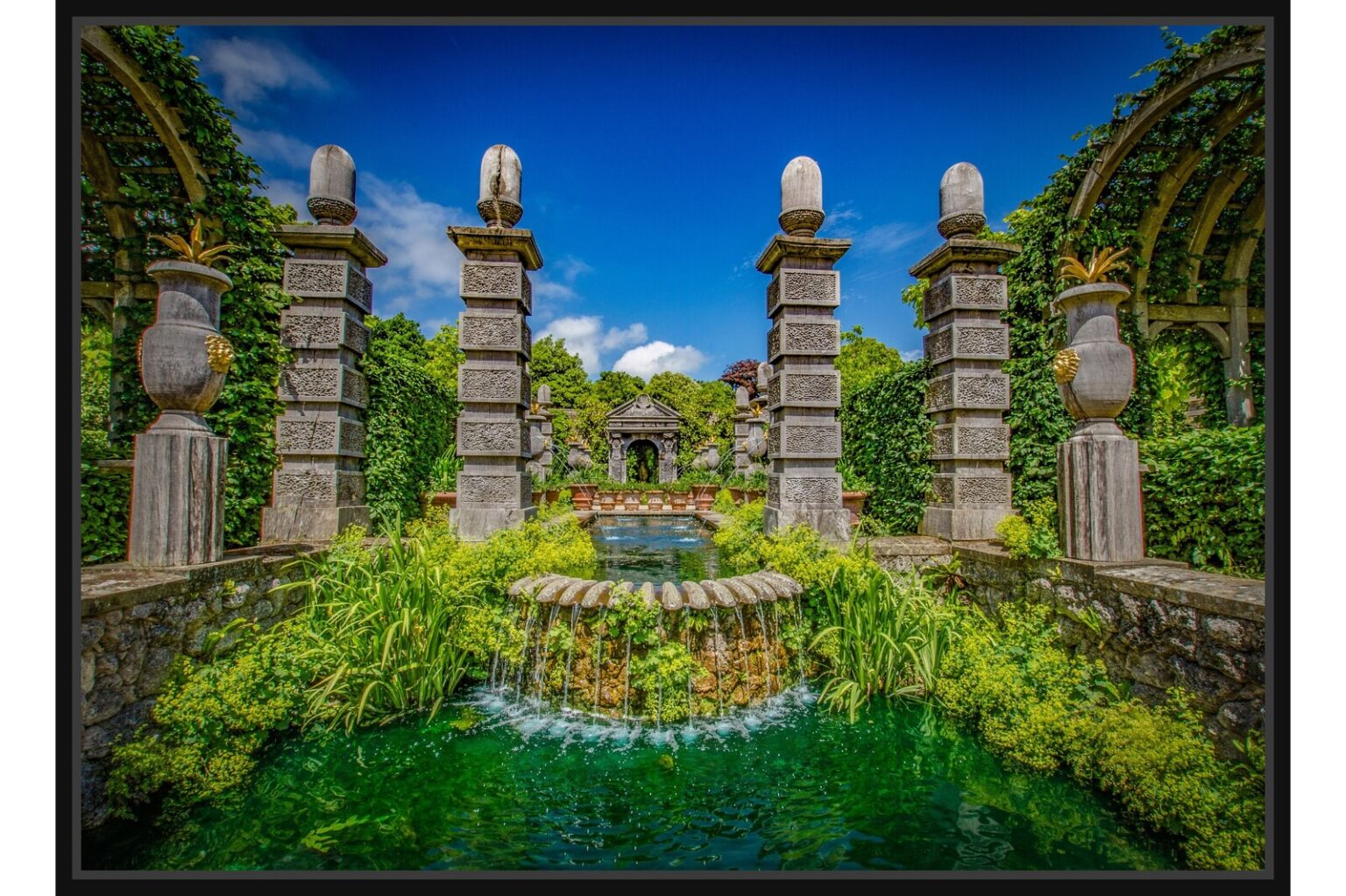 Фотография на пищна градина с фонтан, колони и арки, обвити в зеленина. Ярките цветове и архитектурната симетрия създават хармония между природа и изкуство.