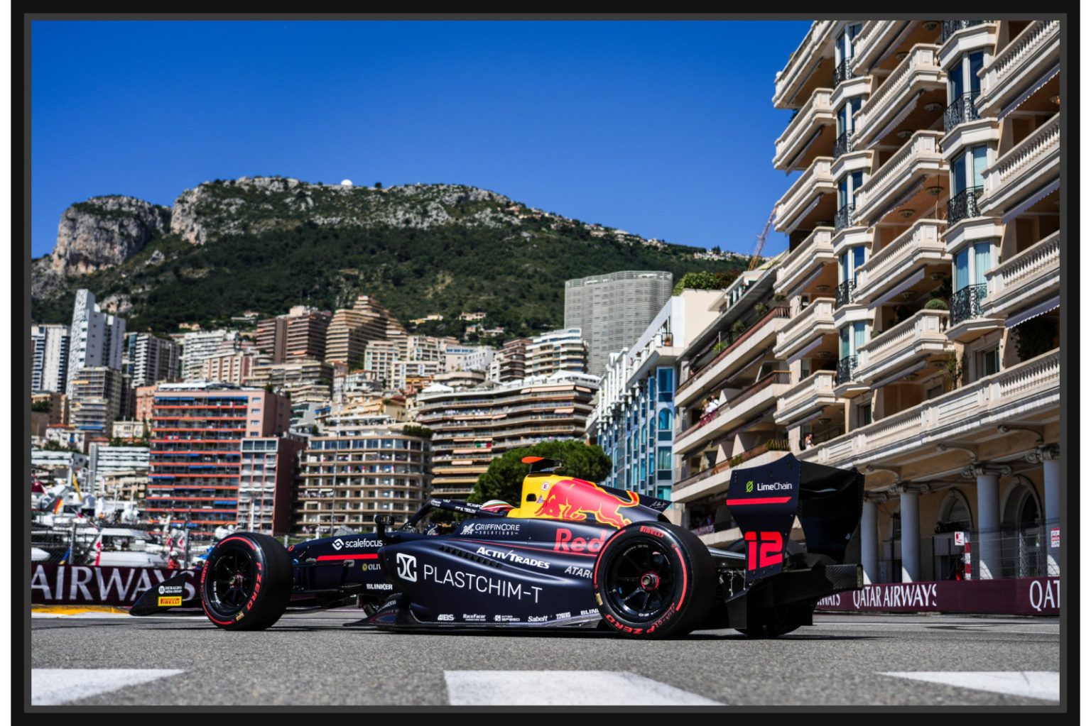 Фотография на болид Red Bull във Формула 3 по улиците на Монако. Задният план с архитектурата и планината придават престиж и уникалност на кадъра.