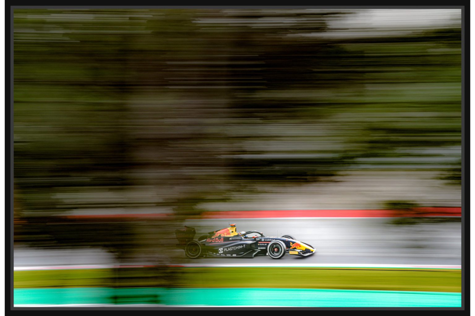 Динамична фотография на болид Red Bull във Формула 3, заснета в движение с ефект на размазване. Изображението подчертава усещането за скорост и мощ в моторните спортове.