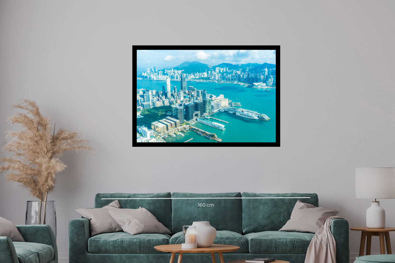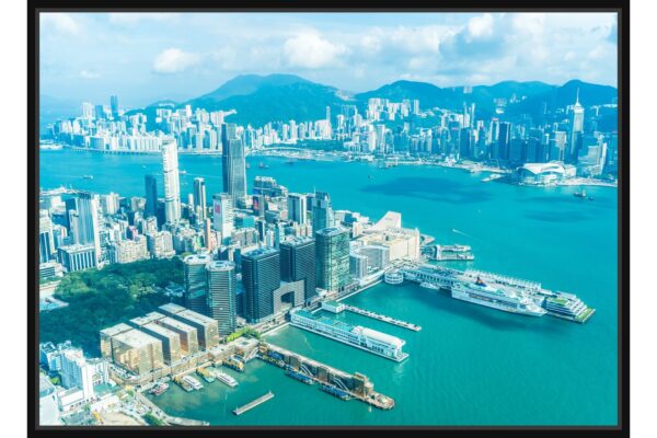 Въздушна гледка към Хонконг, разкриваща модерната архитектура, гъстата градска среда и сините води на пристанището. Снимката акцентира върху динамиката и величието на азиатския мегаполис.