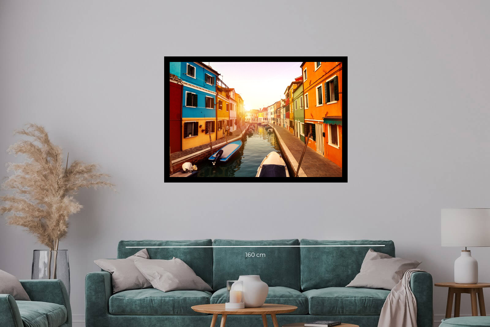 Очарователна снимка на канал във Венеция с редица ярко оцветени къщи и лодки. Слънчевата светлина придава топла атмосфера и романтично усещане.