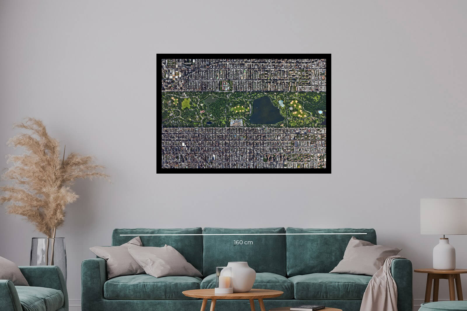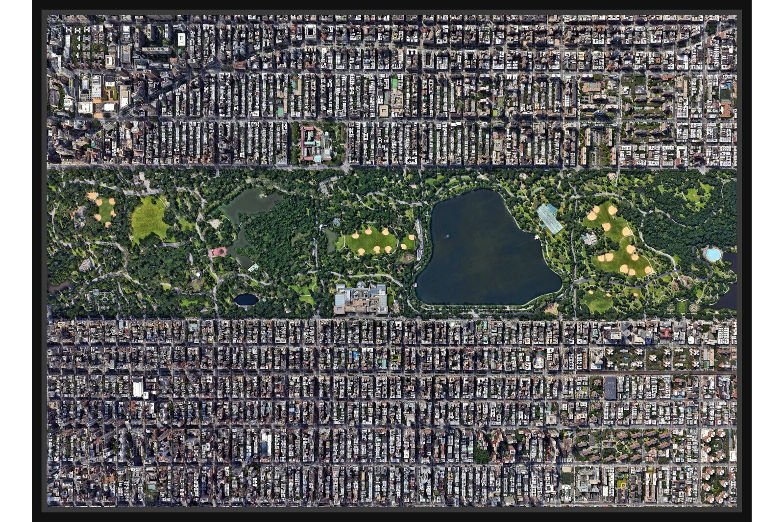 Впечатляваща въздушна фотография на Централ Парк в Ню Йорк, която показва зеления оазис, заобиколен от плътната градска структура на Манхатън. Контрастът между природата и архитектурата създава динамичен и балансиран визуален ефект.