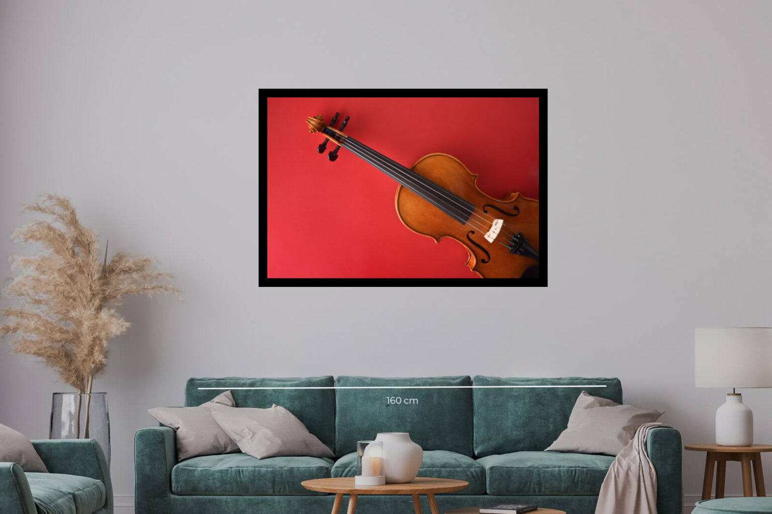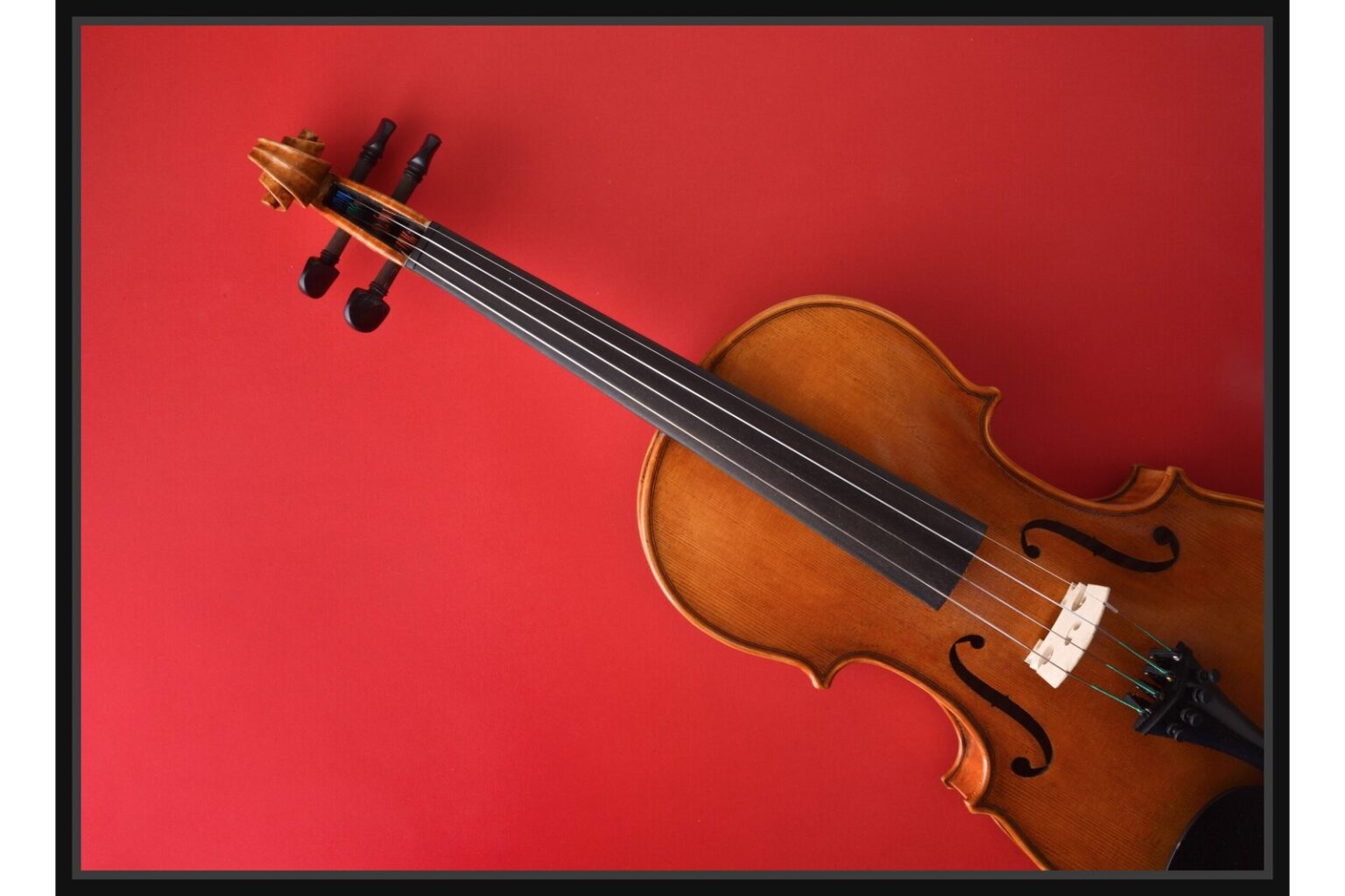 Фотография на цигулка, поставена върху наситен червен фон. Яркият контраст създава динамична и артистична визия, която съчетава класическия инструмент с модерна енергия.