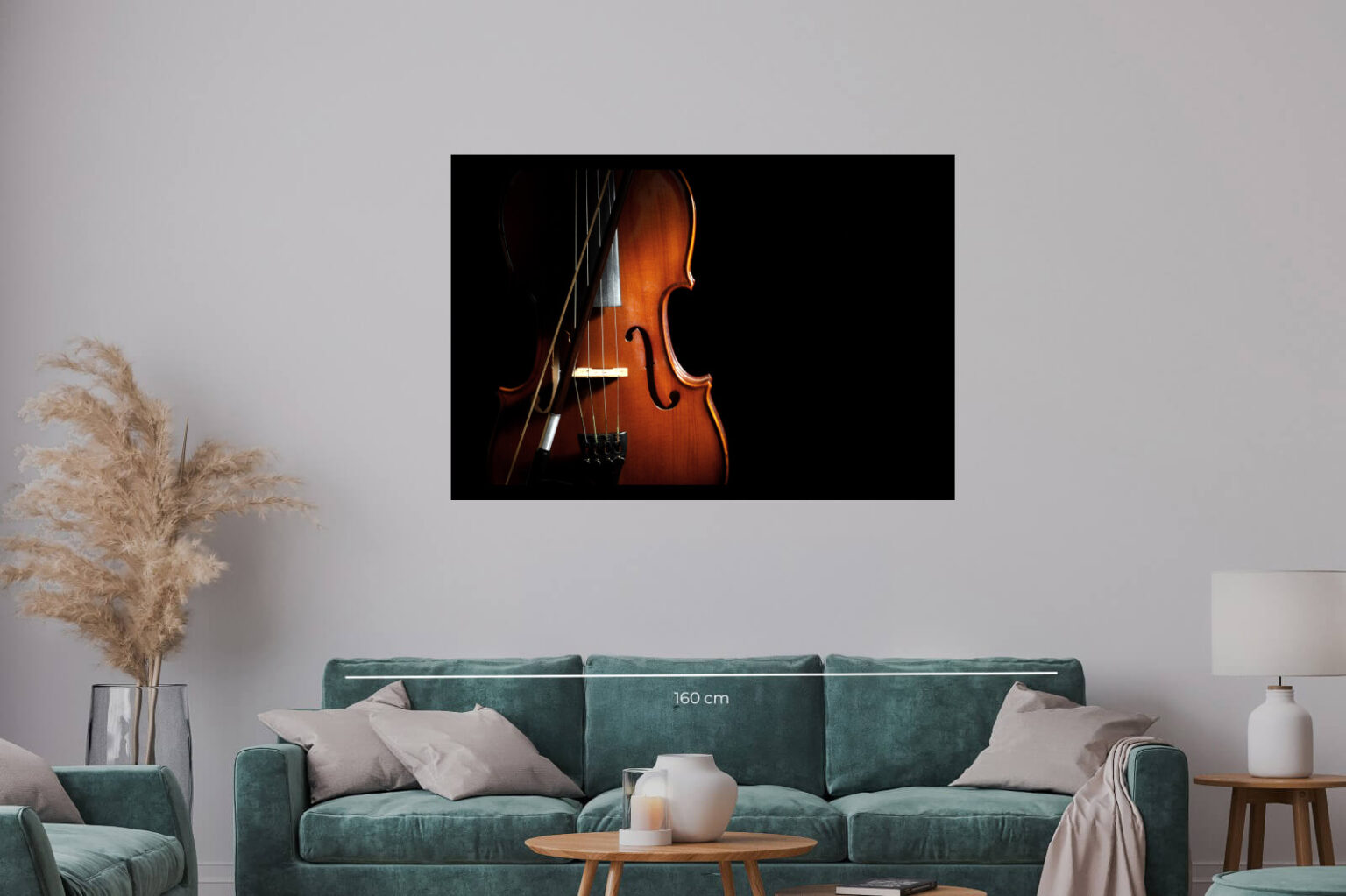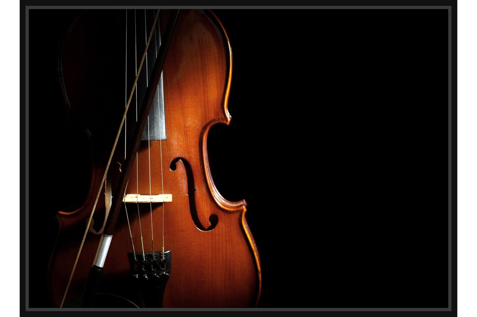 Художествена фотография на цигулка в близък план, осветена драматично на черен фон. Детайлите на дървото и струните подчертават майсторството на класическия инструмент. Атмосферно изображение, което носи усещане за тишина и изисканост.