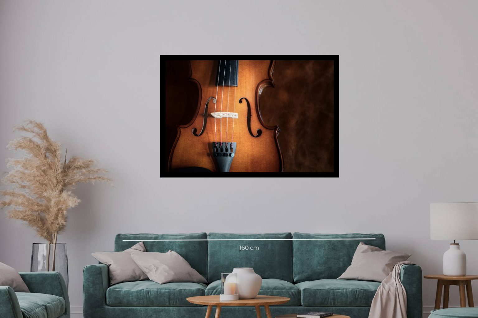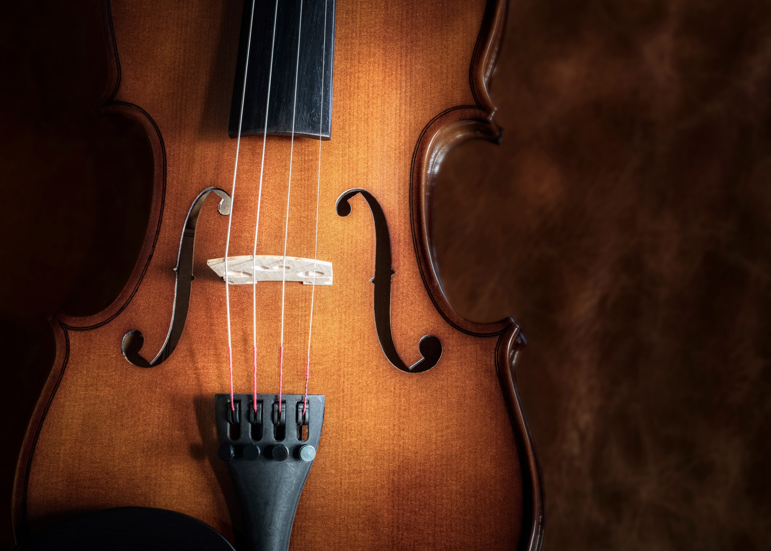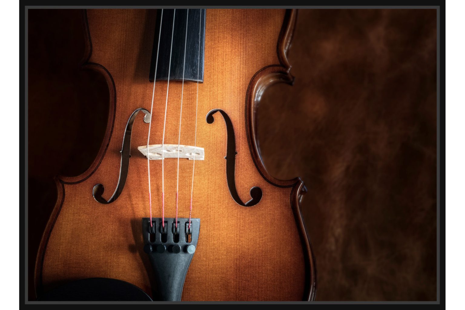 Близък план на цигулка, който подчертава дървената текстура и изящните детайли на инструмента. Фотографията носи усещане за топлина и артистичност, с драматично осветление върху кафяв фон.
