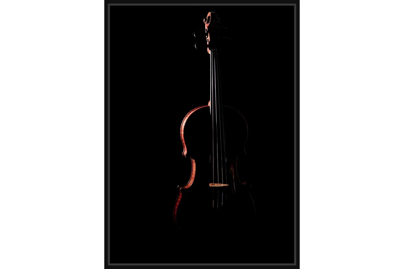 Цигулка с драматично осветление върху черен фон.