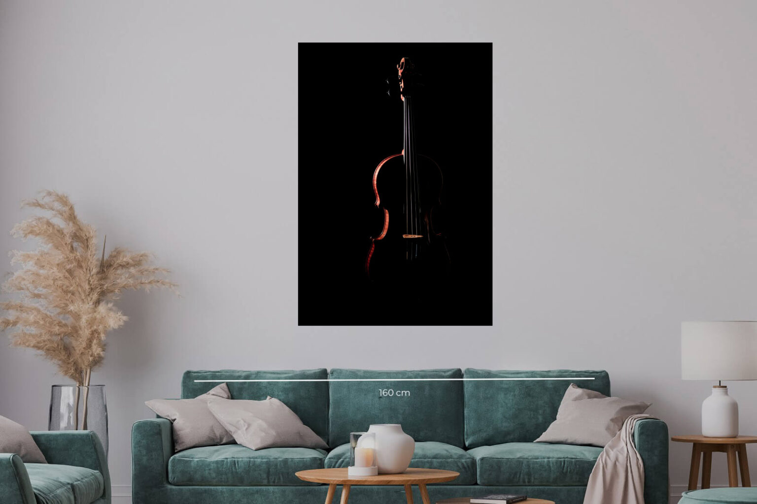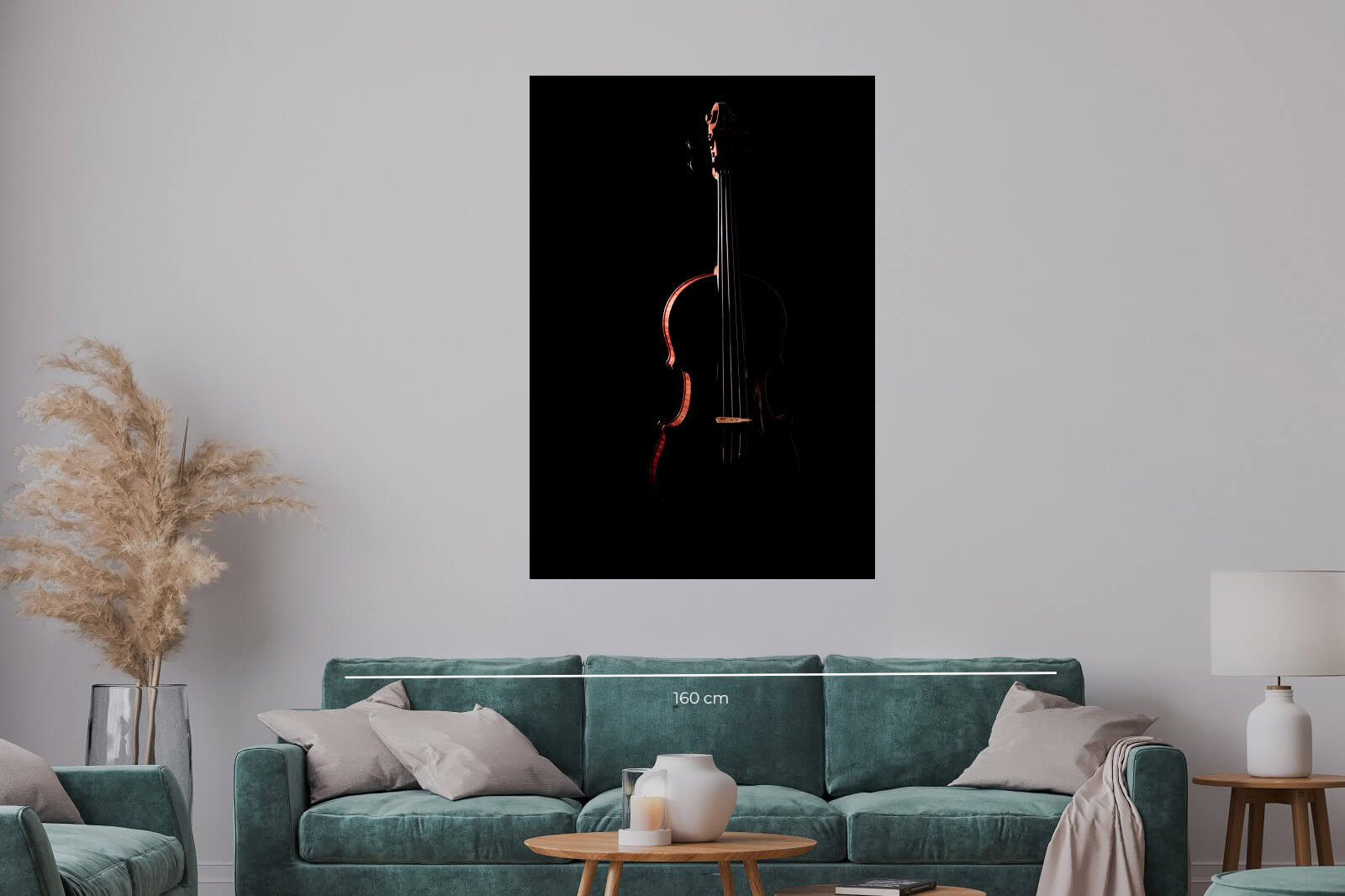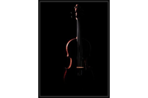 Драматична фотография на цигулка, едва осветена срещу черен фон. Светлината подчертава контурите и създава мистериозна и емоционална атмосфера, символизираща дълбочината на класическата музика.