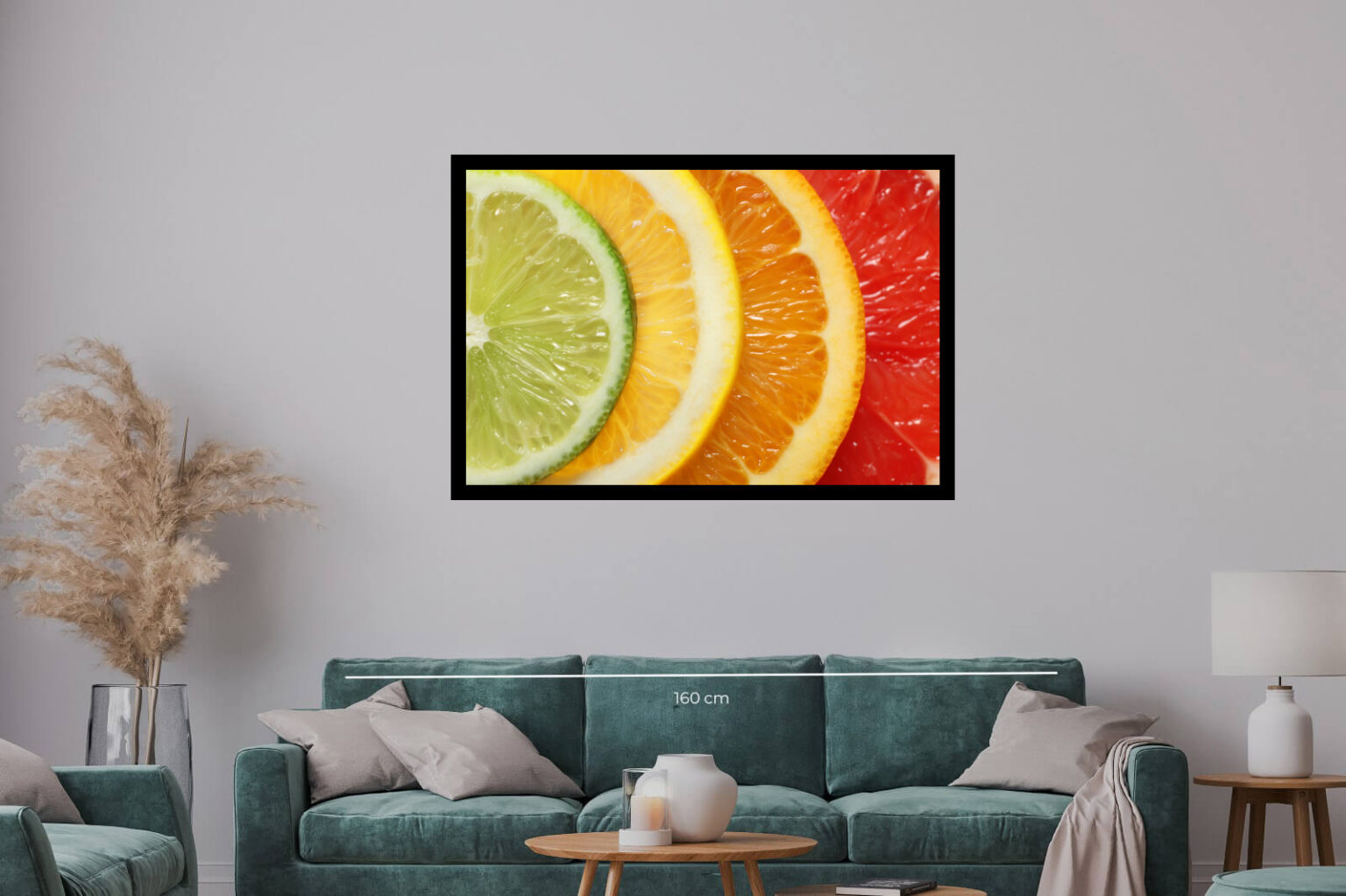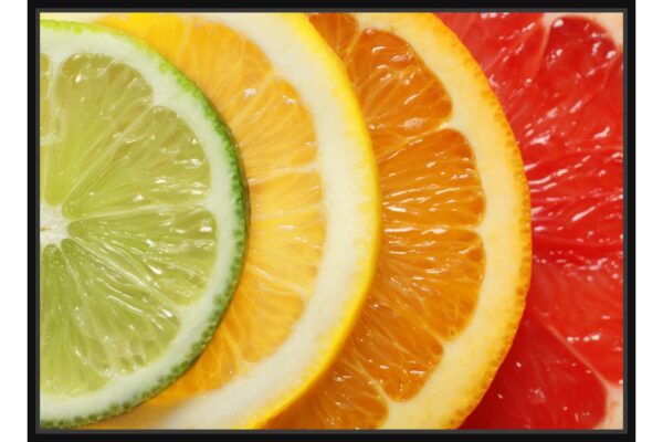 Фотография на нарязани резени лайм, лимон, портокал и грейпфрут, подредени в красив цветови контраст. Снимката носи енергия и свежест.