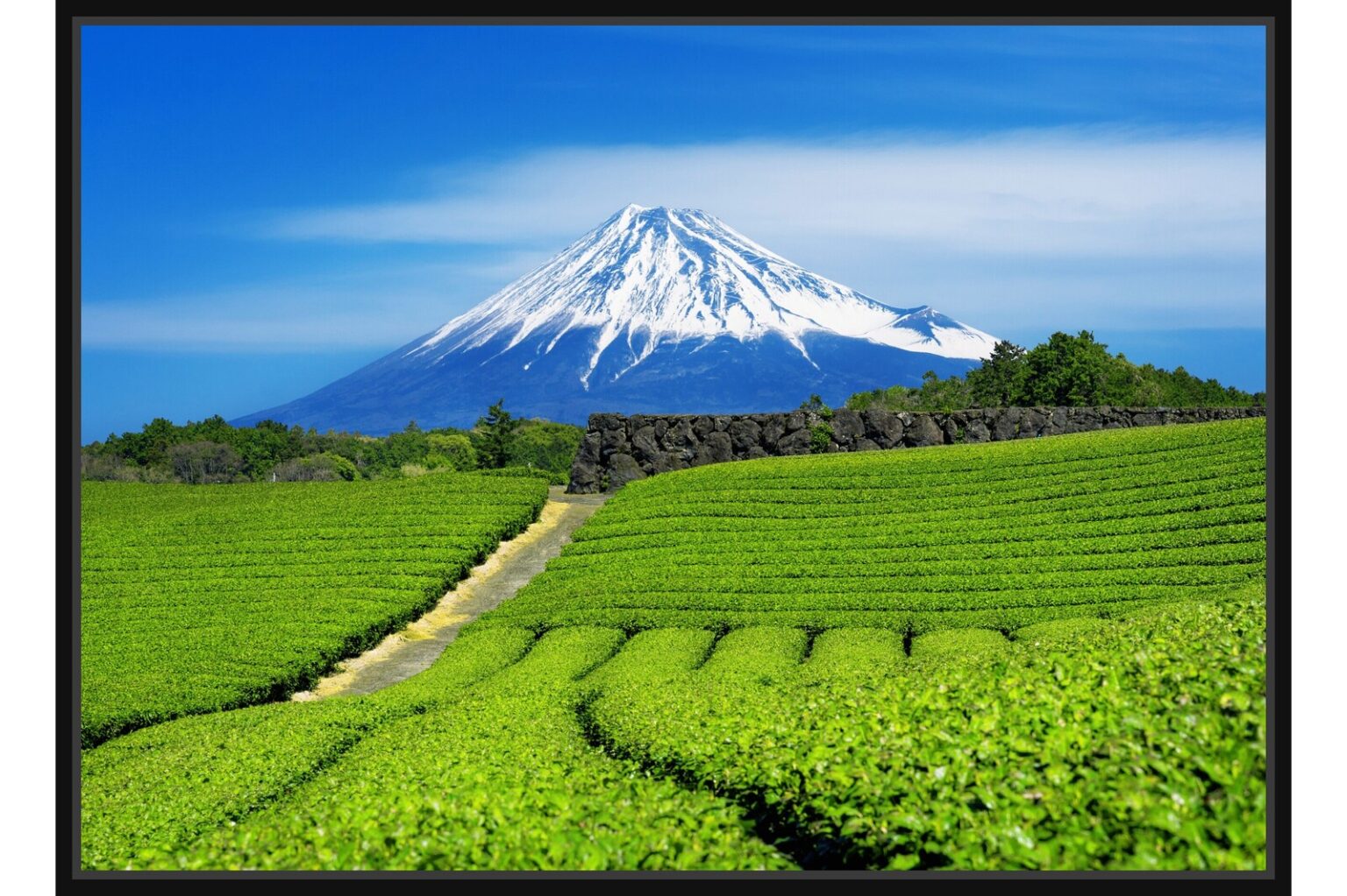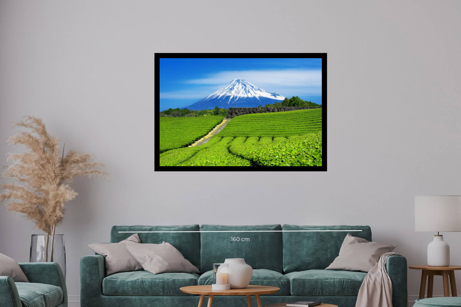 Фотография на японски чаени плантации с пътека, водеща към величествения връх Фуджи. Контрастът между зелените насаждения и белия връх създава хармония и символизира японската култура.