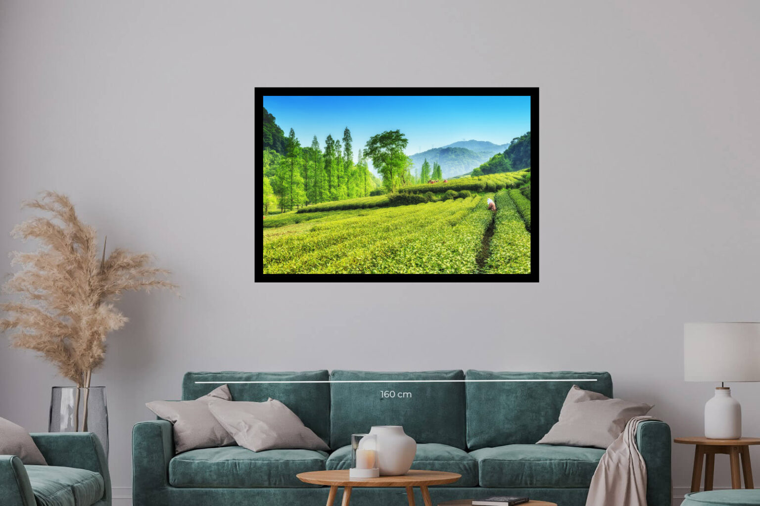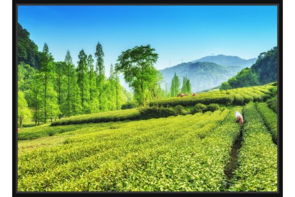 Фотография на яркозелени чаени полета в планините с работници, събиращи реколта. Яркото небе и наситените цветове подчертават богатството на природата и труда на хората.